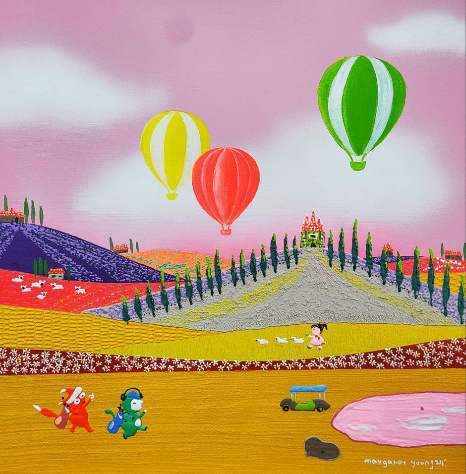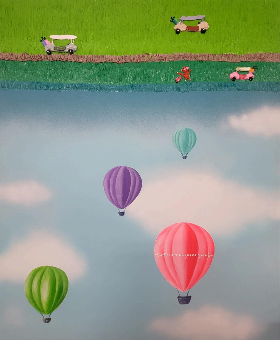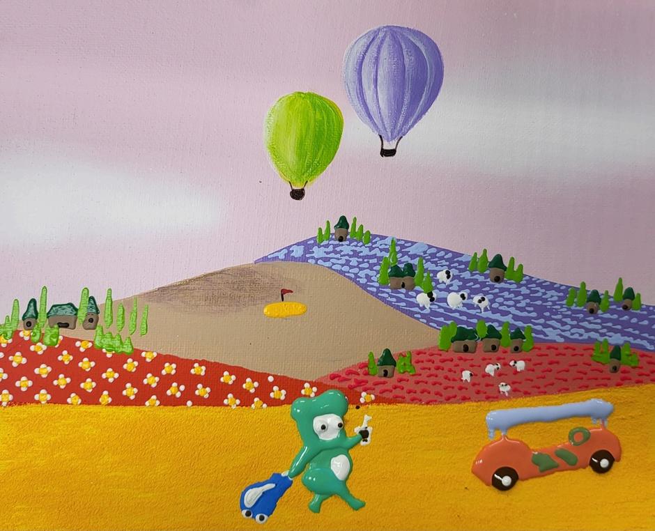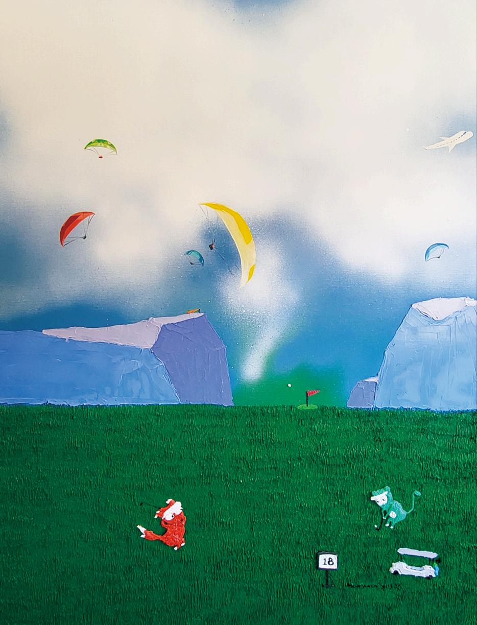 A golf course reimagined through painting and pop sensibility. Playful characters,YeosiandO-gong,sharelittlestoriesfromthefield. Intoday’ssociety,manyembracesolitudewhilepresentingonlyfragments of happiness on social media. Behind these cheerful images often lies loneliness.Smilescaughtonscreenfadethemomentthephoneisturned off,leavingonlyemptiness.