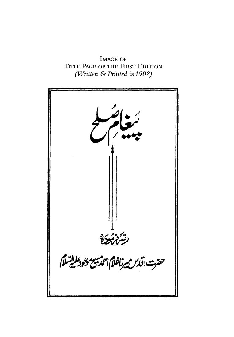 In precarious times such as these I invite you to truce, as reconciliation is urgently required by both nations. Many a calamity is befalling the world; there are earthquakes and there are famines. Over and above the earthquakes and famines we continue to be plagued by the bubonic pestilence. Moreover, the i in r ations ic od as con y d to m rt r confrm that if people do not mend their evil ways and practices and do not repent their sins, the world will be further visited by other severe calamities. One misery will not end before another follows. Eventually, people will reach the end of their tether and will wonder what is happening to them and what next is in store for them. They will be pushed to the edge of their senses by calamity upon calamity. So, take heed my countrymen, before such evil days confront you. It is highly essential that Hindus and the Muslims should come to terms with each other and if either of the two parties is guilty of such excesses as obstruct the path of peace, they are better advised to desist from pursuing that course. (p.12)