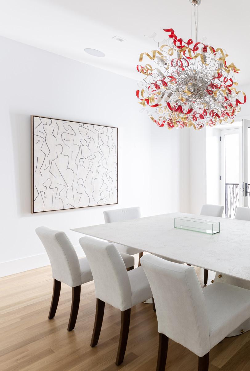 Enter into a dramatic gallery and entertaining room with white oak floors, a glass staircase, and Italian crystal pendants by Il Pezzo Mancante. A spacious Eat-In-Kitchen, with room for a table for eight, faces the beautiful garden and is a chef’s dream. Top-of-the-line professional-grade appliances by Thermador include two full-size refrigerators, wine cooler, a six-burner gas range and grill, microwave, and two dishwashers. Designer Italian cabinetry and radiant floor heating complete this comfortable home hearth. Sunshine and natural light pour through the oversized windows facing South and East.