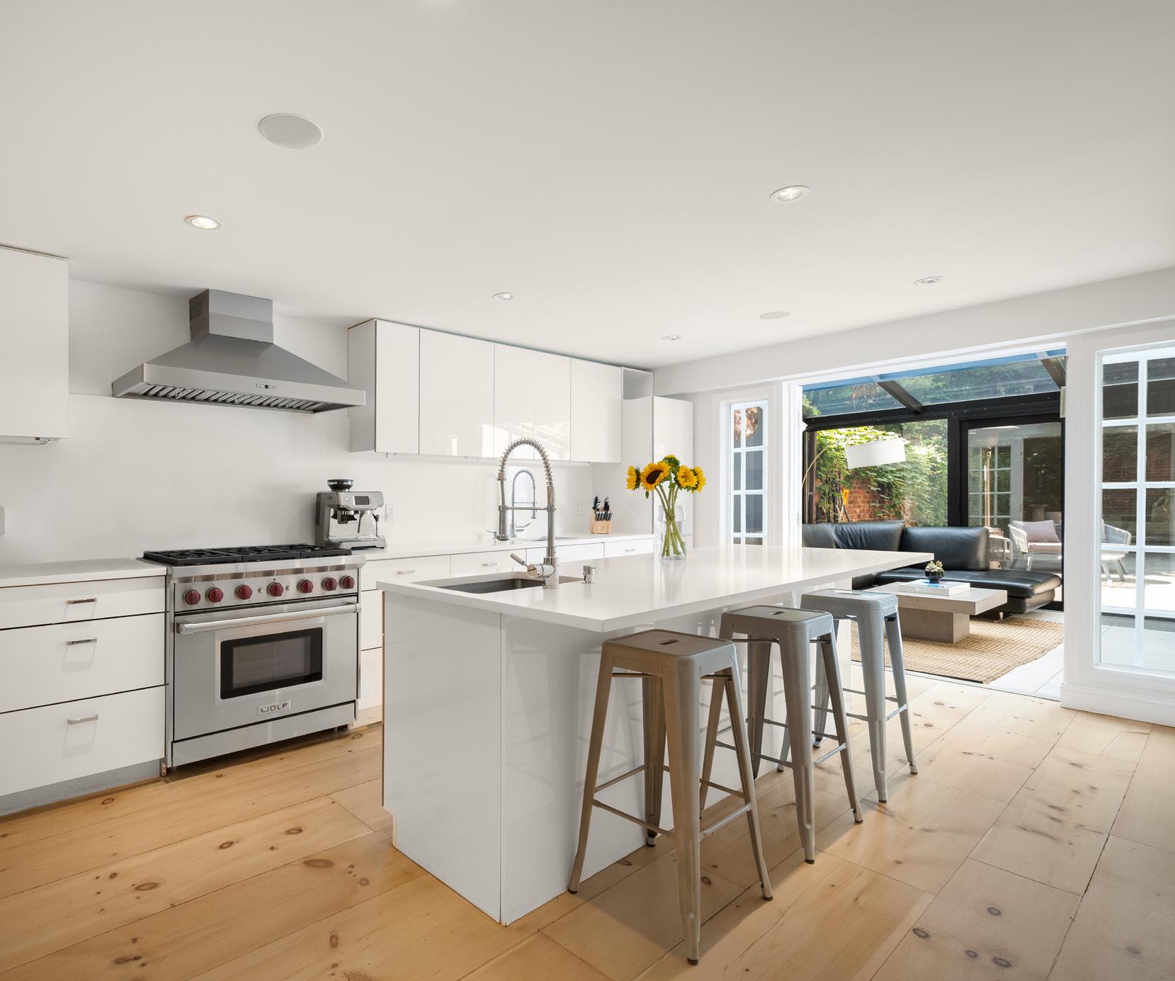 The garden level has undergone a remarkable renovation, featuring floor-to-ceiling windows framed in wood and a thoughtfully designed open layout. The dining room/living room and working fireplace create a cozy and inviting atmosphere, while the suburban eat-in chef’s kitchen, complete with Wolf appliances, Sub Zero double fridge and a central island, create a culinary enthusiast’s dream. Wide plank oak floors span the entire main floor, adding a touch of warmth and elegance and conveniently, a powder room is also found on this floor.