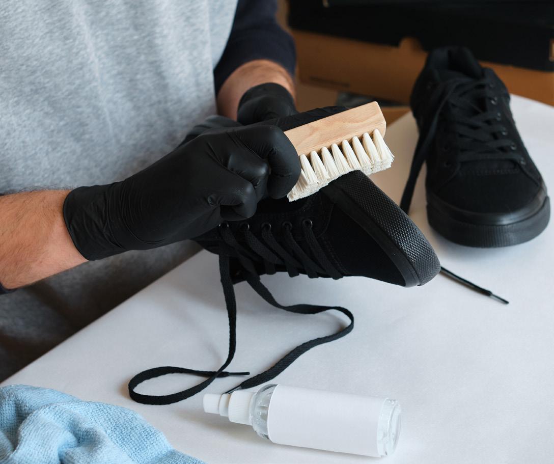 För att borsta bort damm, smuts och grus. En mjuk borste kan användas på läder och textil, och en hårdare borste på sulor i gummi.