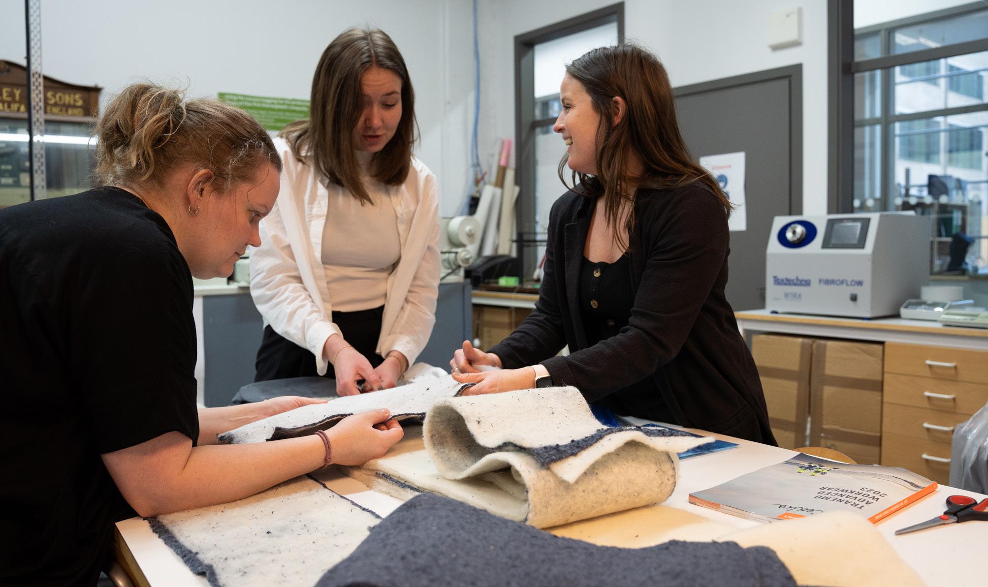 Anna-Karin Lindfors från Textilhögskolan i Borås tillsammans med Tilda Larsson och Cecilia Rydäng tar fram nonwoven-prover.