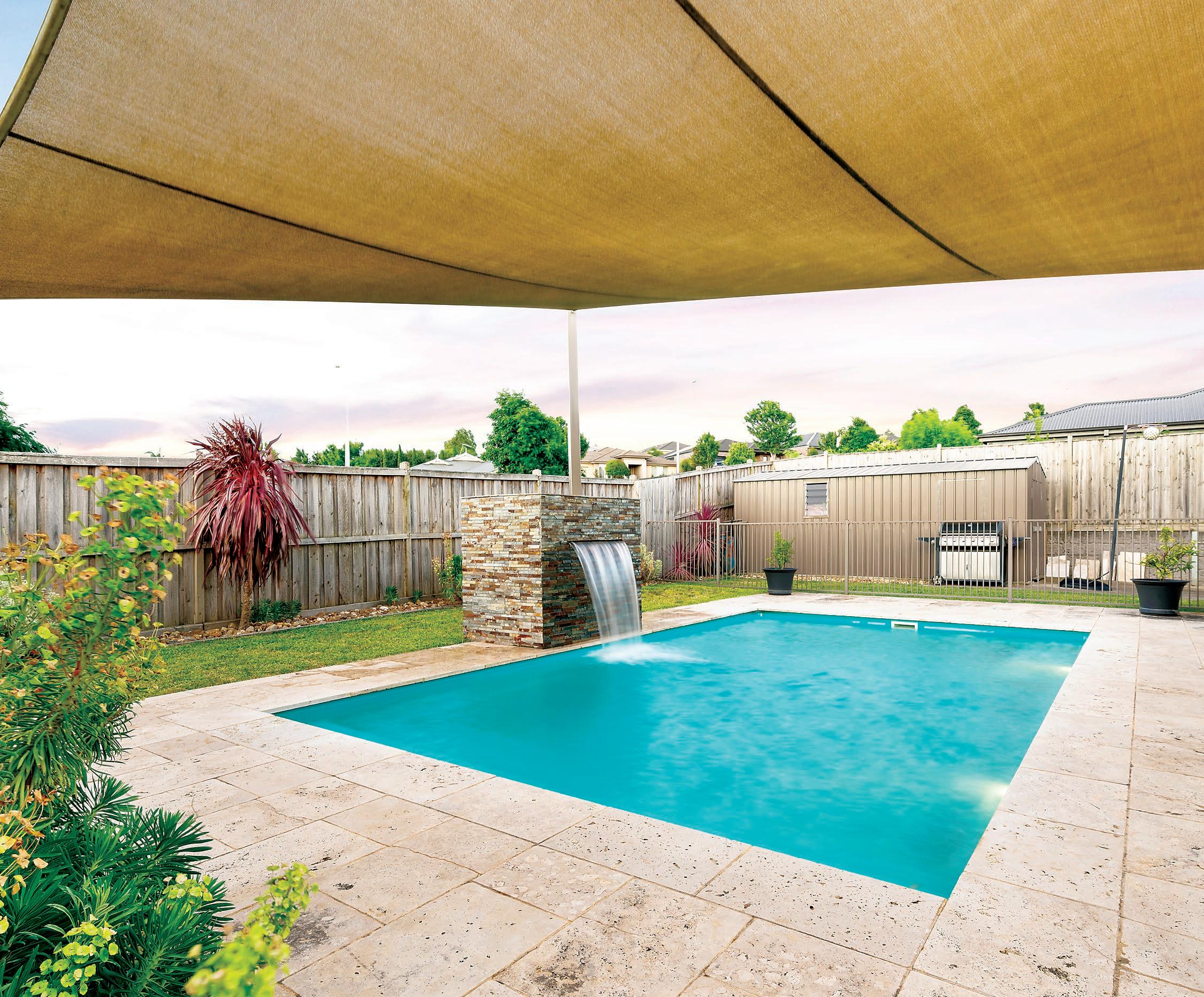 Securely fenced, the pool is salt and magnesium chlorinated and features a stacked stone waterfall, large shade sail and an outdoor shower.