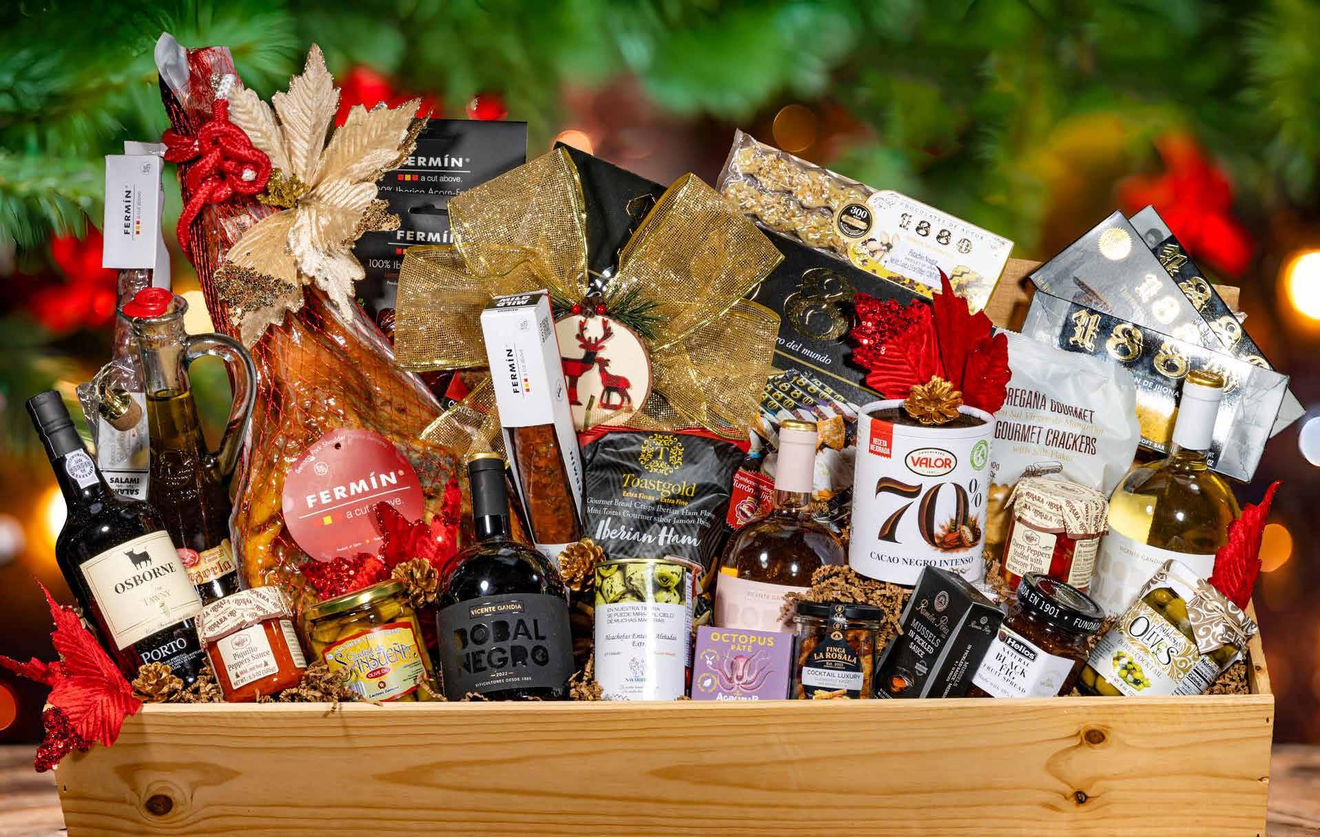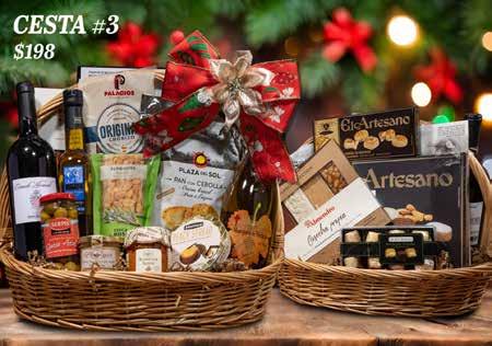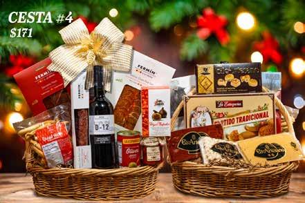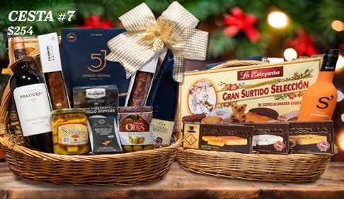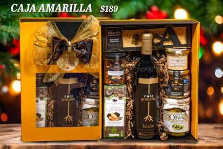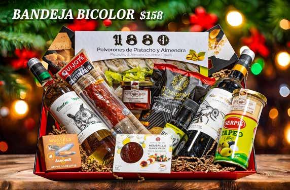 Jamón serrano, coppa serrana, chorizo, queso manchego, queso Idiazabal, regañas, pretzels, aceitunas, uvas, orejones, pera y blueberries.