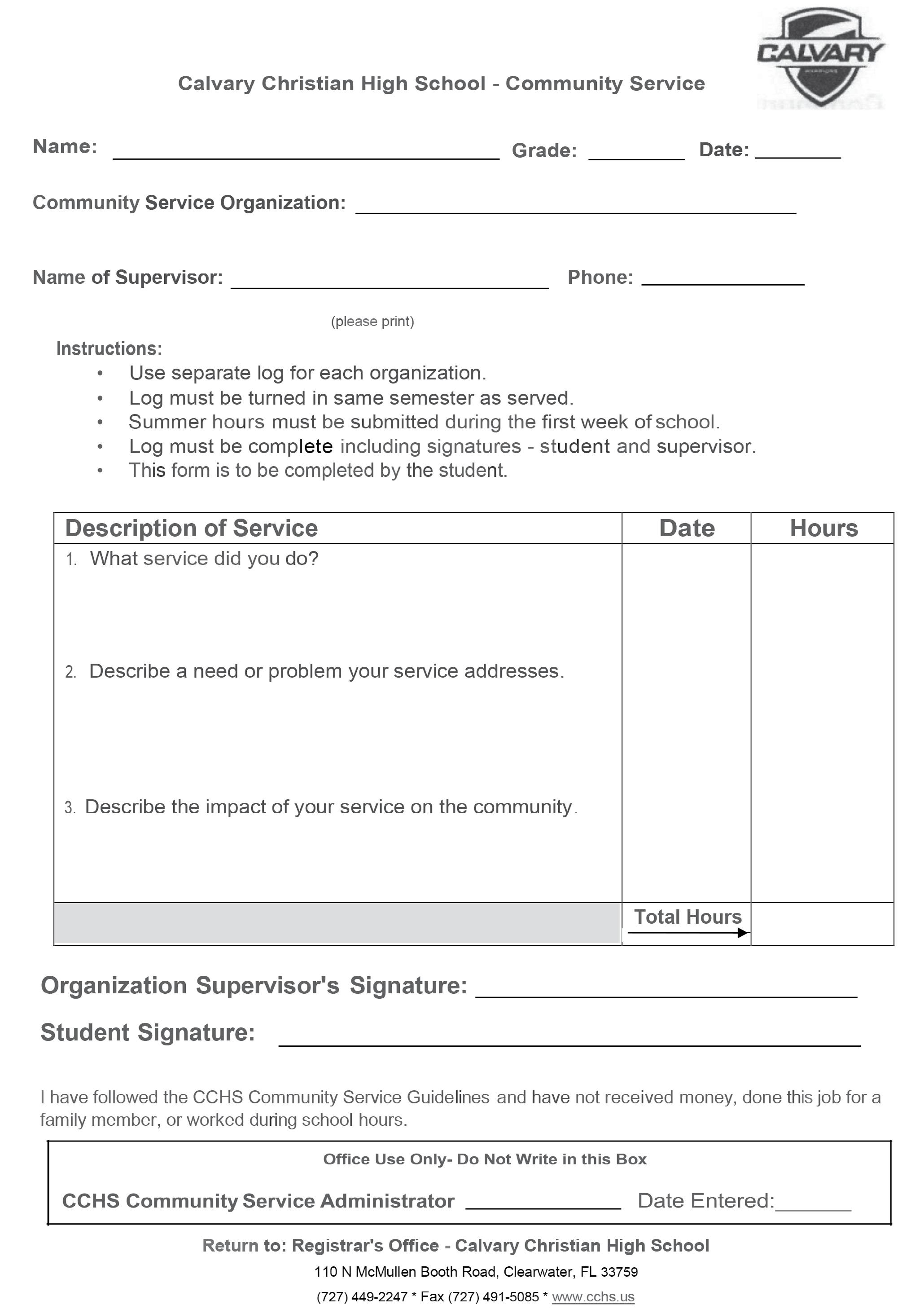 One of the goals we have for our students at Calvary Christian High School is to develop the Christian character trait of servanthood. Calvary encourages students to serve their community, their local church, and local agencies committed to serving those less fortunate. Therefore, a minimum of 100 hours of Community Service is one of the requirements for graduation.