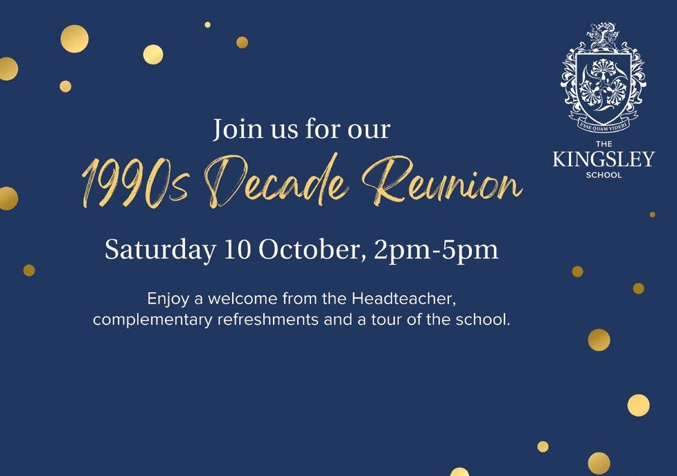 Did you leave Kingsley School in 1990, 91, 92, 93, 94, 95, 96, 97, 98 or 99 after Sixth Form or Senior School? Join us for a very special reunion. Share memories and see Kingsley School as it is today. Members of staff from the 1990s are also very welcome. This will be a relaxed afternoon with a welcome from Headteacher Dr Sarah Howling, tours of the school and complimentary afternoon tea.