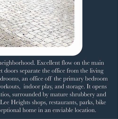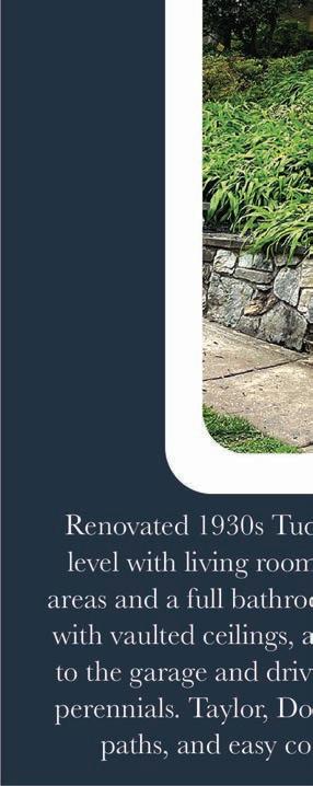 beat of the home with its gathering great room, gas fireplace and coffered ceilings. The kitchen’s premier appliances, butler’s and storage pantries and oversized island are eloquent. Upstairs are three-four spacious bedrooms. The third primary bedroom is oversized with a sitting area, gas fireplace and brand new opulent, spa-like bath with soaking tub, separate steam shower, double sinks and access/ option to have one or two walk-in closets and laundry. A third bedroom has an ensuite bathroom and two others could potentially share a jack and jill bath. From this level is a full staircase access to the top-level flex space- could be a great in-home office, playroom or another bedroom. The paved driveway leads to an oversized two car garage and offers ample parking. The private outdoor deck is approachable from multiple directions and compliments the great entertaining floor plan throughout. And as you could expect the roof is long-lasting slate.