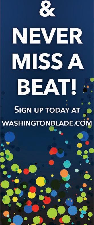 Brown at 202-747-2077, ext. 8075. Distributed by Southwest Distribution Inc. All material in the Washington Blade is protected by federal copyright law and may not be reproduced without the written consent of the Washington Blade. The sexual orientation of advertisers, photographers, writers and cartoonists published herein is neither inferred nor implied. The appearance of names or pictorial representation does not necessarily indicate the sexual orientation of that person or persons. Although the Washington Blade is supported by many fine advertisers, we cannot accept responsibility for claims made by advertisers. Unsolicited editorial material is accepted by the Washington Blade, but the paper cannot take responsibility for its return. The editors reserve the right to accept, reject or edit any submission. A single copy of the Washington Blade is available from authorized distribution points, to any individual within a 50-mile radius of Washington, D.C. Multiple copies are available from the Washington Blade office only. Call for rates. If you are unable to get to a convenient free distribution point, you may receive a 52-week mailed subscription for $195 per year or $5.00 per single issue. Checks or credit card orders can be sent to Phil Rockstroh at prockstroh@ washblade.com. Postmaster: Send address changes to the Washington Blade, PO BOX 53352 Washington, DC 20009. The Washington Blade is published weekly, on Friday, by Brown Naff Pitts Omnimedia, Inc. Rates for businesses/institutions are $450 per year. Periodical postage paid at Washington, D.C., and additional mailing offices. Editorial positions of the Washington Blade are expressed in editorials and in editors’ notes as determined by the paper’s editors. Other opinions are those of the writers and do not necessarily represent the opinion of the Washington Blade or its staff. To submit a letter or commentary: Letters should be fewer than 400 words; commentaries should be fewer than 750 words. Submissions may be edited for content and length, and must include a name, address and phone number for verification. Send submissions by e-mail to knaff@ washblade.com. ©2024 BROWN NAFF PITTS OMNIMEDIA, INC. VOLUME 55 ISSUE 18 Te Only Stack Style Guide v 1 | February 2018