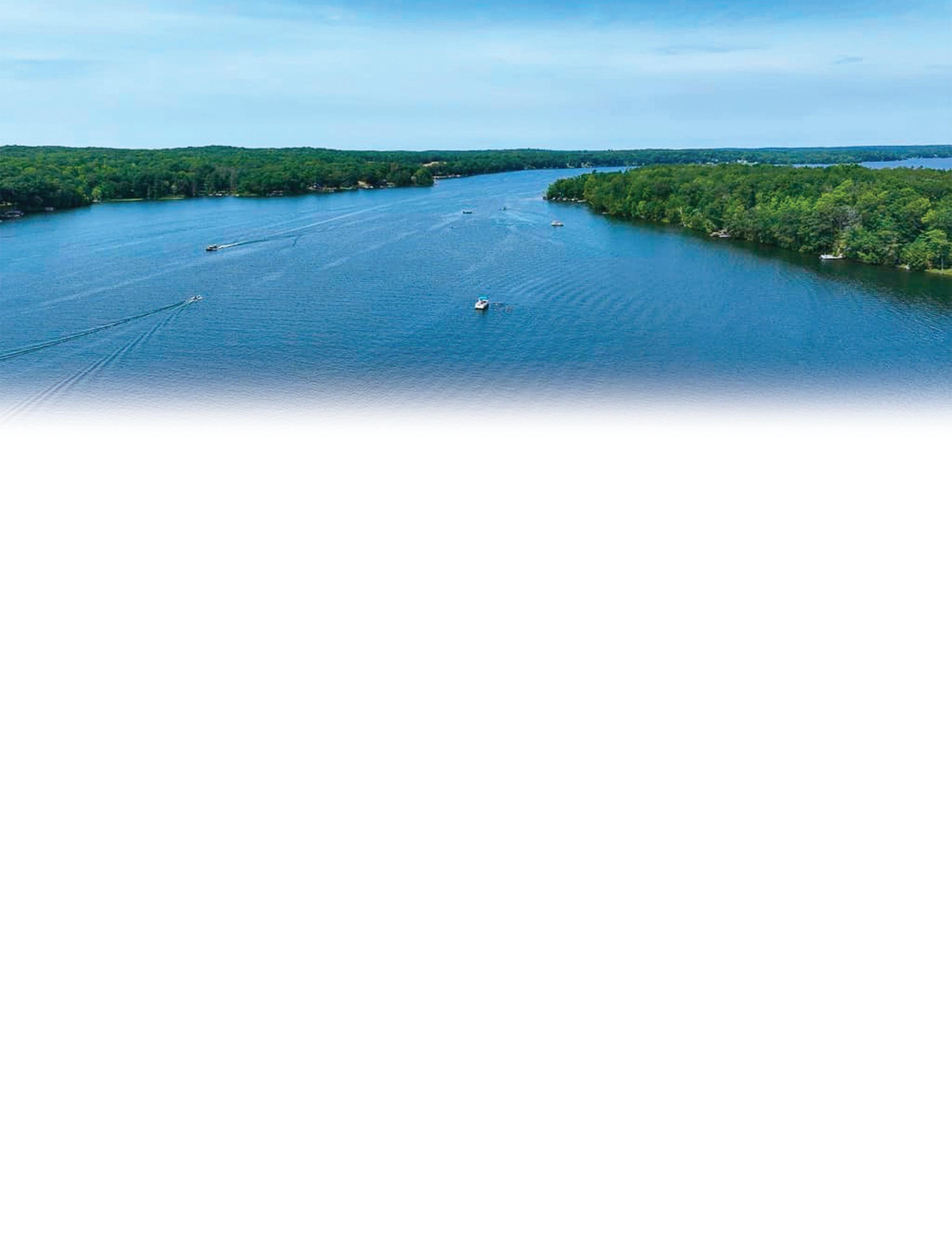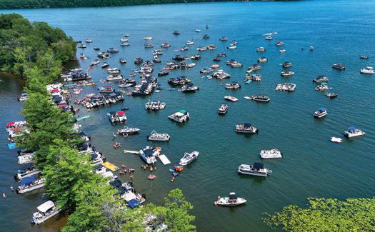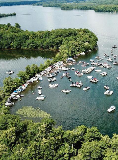 Pontoons, fishing boats, kayaks, jet skis—if it floats, it’s welcome! Boaters gather around “the big island” on Long Lake, dropping anchor