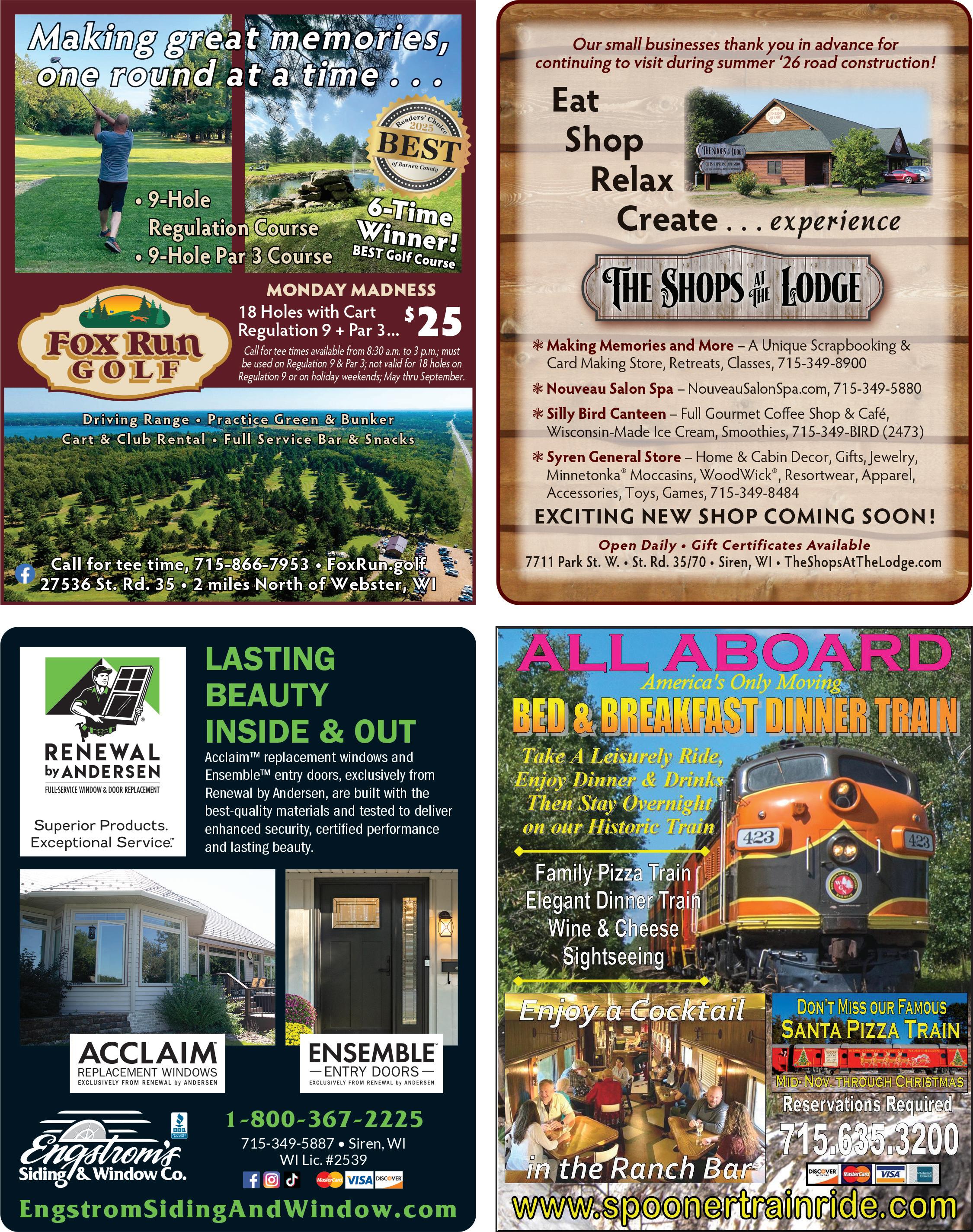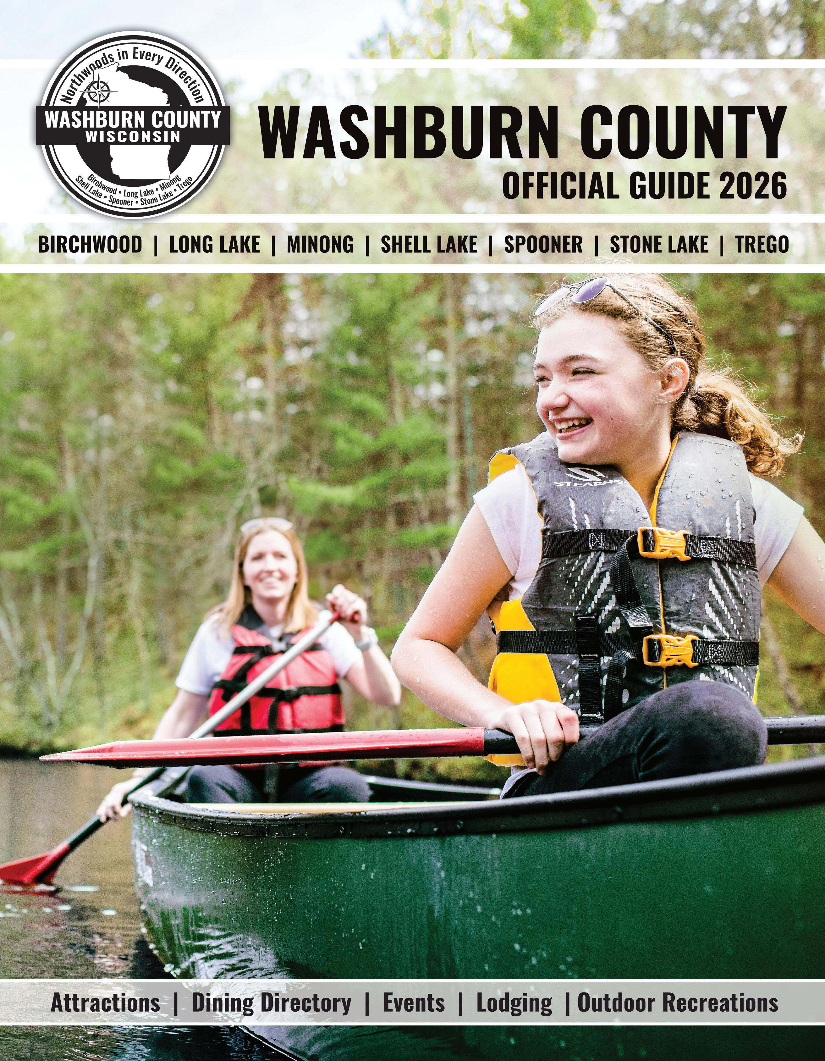 The Washburn County Official Guide was prepared by Washburn County Tourism Association and Advance Printing, in cooperation with participating businesses and communities. All rights reserved by Washburn County Tourism Association. We have done our best to provide the most accurate information possible. All details are subject to change. Please let our advertisers know you saw their ad in the Washburn County Visitor Guide.