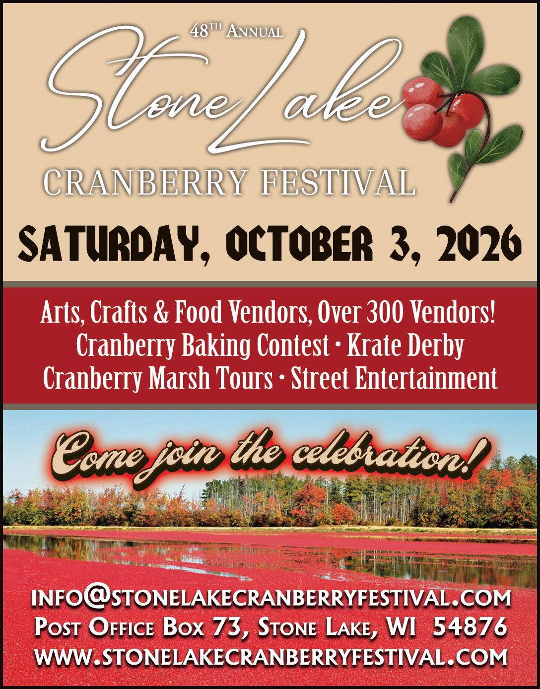1ST SATURDAY IN OCTOBER For 45 years, the small town of Stone Lake has welcomed thousands of visitors to celebrate the annual cranberry harvest. For just one day, this community is home to some of the best art & crafts and tastiest cranberry treats.