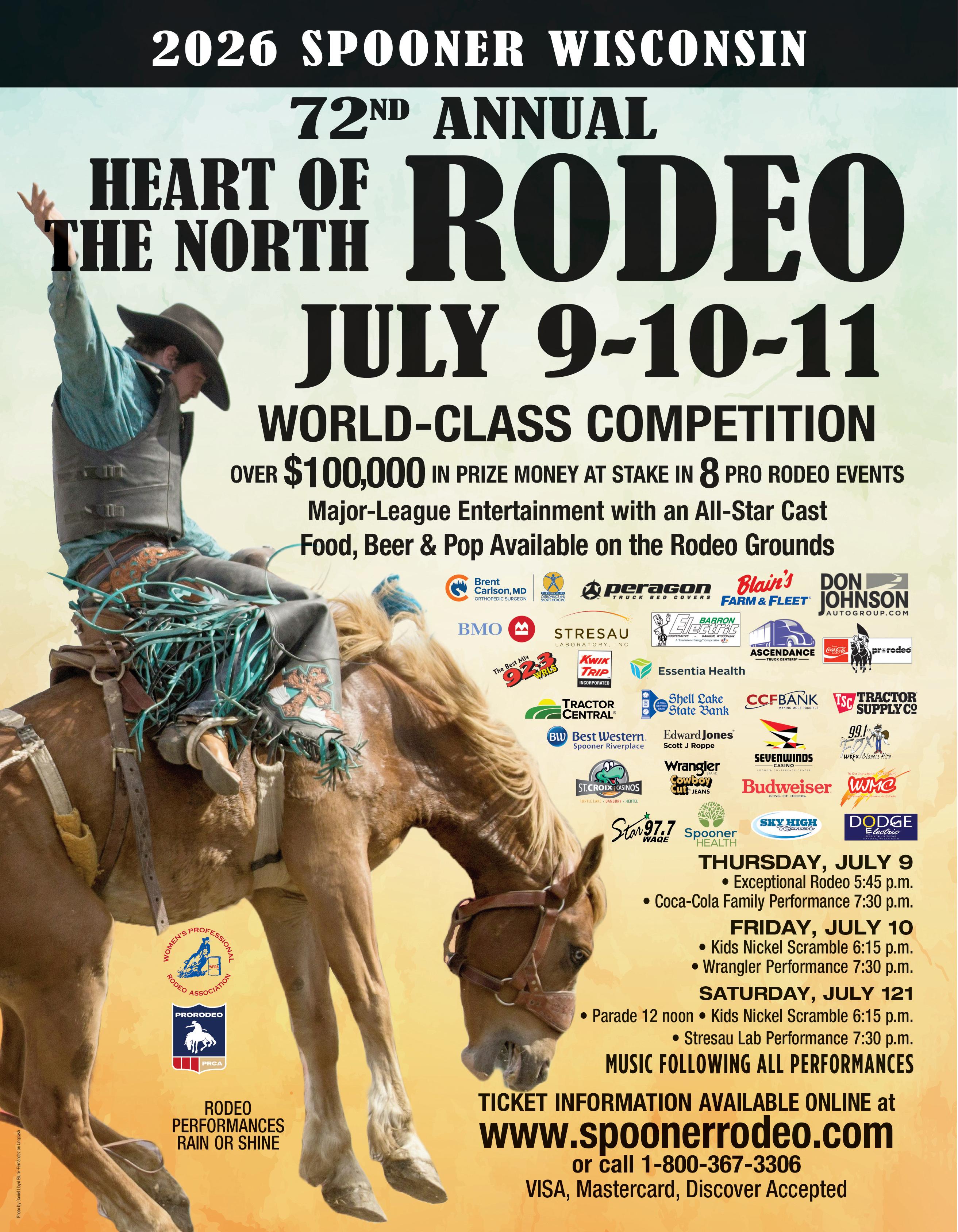 2ND WEEKEND IN JULY For 70 years, the Heart of the North Spooner Rodeo has attracted rodeo fans from all over the United States to view some of the top competitors in the world compete for prize money and fame.
