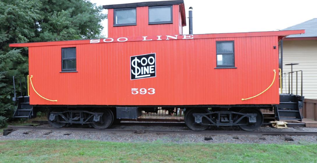 Original Stone Lake Soo Line Depot, caboose and 1926 Town Hall.