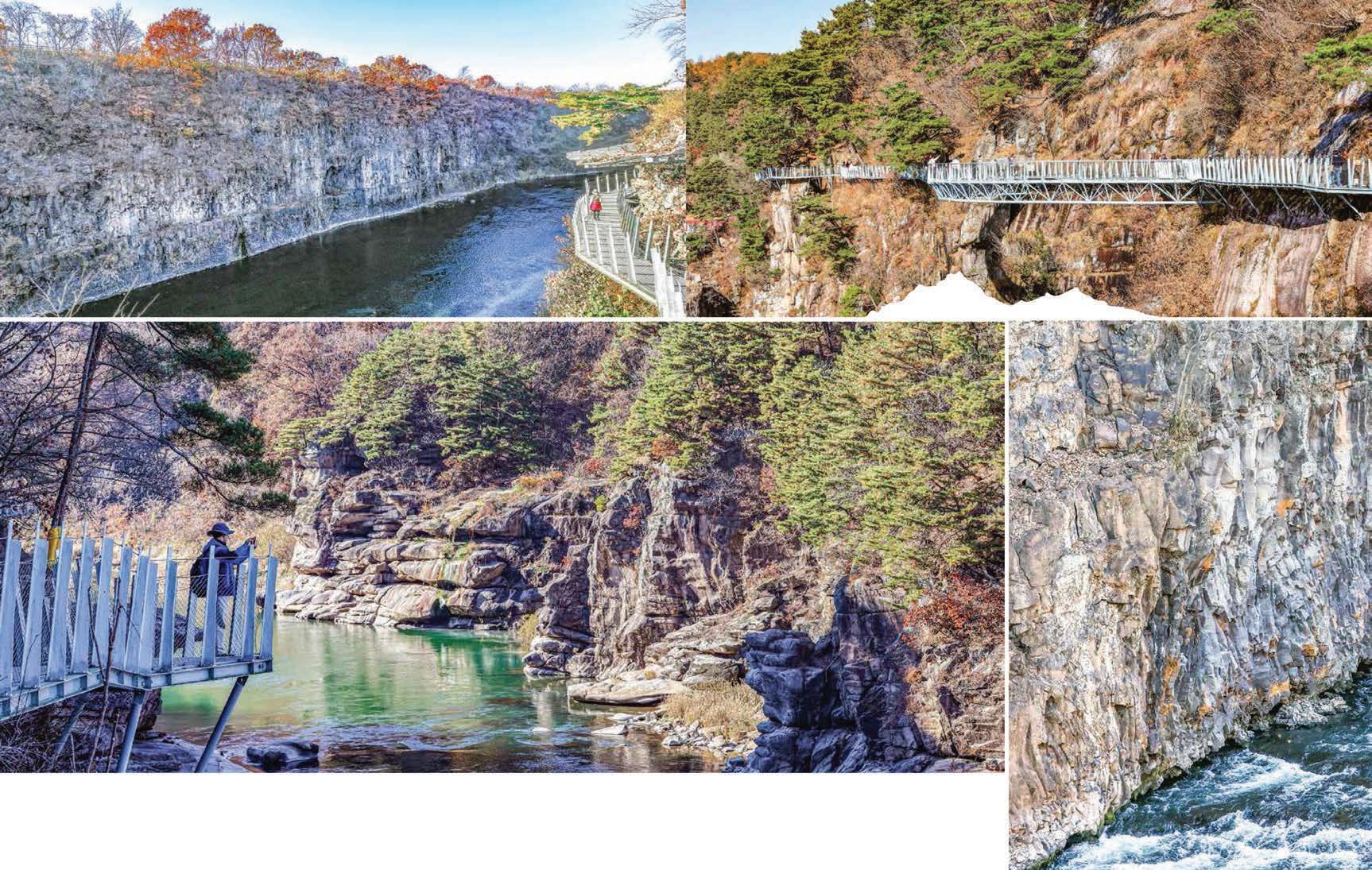 분단의 시간이다. 이 시간은 북한 노동당 옛 철원군 당사 건물 앞에 서 있는 김현선 작가의 조각 작 품 ‘두근두근’에 표시되고 있었다. 분단 현실의 슬픔과 통일 염원을 표현한 이 작품에서 하트 모양 심장은 통일을 상 상할 때의 두근거림을 나타낸다. 옛 노동당사 건물은 철원역사문화공원 맞은편에 있었다. 이 건물은 1946년 초 북한 정권 아래 서 착공돼 지상 3층, 연건평 580평 규모 로 지어졌다. 벽돌, 철근 콘크리트 등으로 튼튼하게 지어져 한국전쟁 때도 무너지지 않았다. 북한은 이 건물을 지을 때 주민들을 대 상으로 성금을 모으고, 인력과 장비를 강 제 동원한 것으로 알려졌다. 2002년 근대문화유산 등록문화재로 지 정돼 관리되고 있으며, 남북 평화 기원 행 사가 이 건물을 배경으로 열리곤 한다. 통일과 평화를 기원하는 땅이 된 철원이 영화를 되찾을 날은 언제인가. ◇아찔한 한탄강주상절리 잔도 걷기 벼랑 끝에 선 적은 있을지라도 벼랑 옆 허공을 걸어본 경험은 별로 없을 것이다. ⇬7면으로 이어집니다