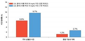 로 인한 사망, 심근경색, 뇌졸중 등 주요 심 혈관 사건 발생률은 집중 목표군(55㎎/dL 미만)에서 6.6%로 나타났다. 기존 목표군 (70mg/dL)의 심혈관 사건 발생률은 9.7% 로, 집중 목표군보다 높았다.