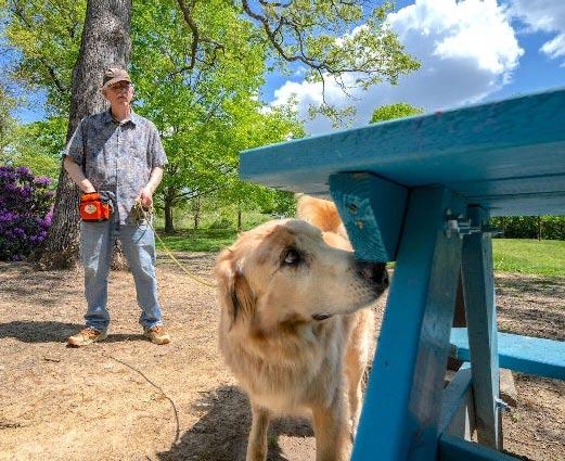 Fozzie, a labrador/golden retriever mix, and his owner, Scott Hurst of Salem, Virginia, search a park bench for evidence of the invasive spotted lanternfly. A new study led by Virginia Tech found that volunteer dog-handler teams can detect the elusive egg masses of the spotted lanternfly, an invasive insect that’s damaging farms and forests across the eastern and central United States.