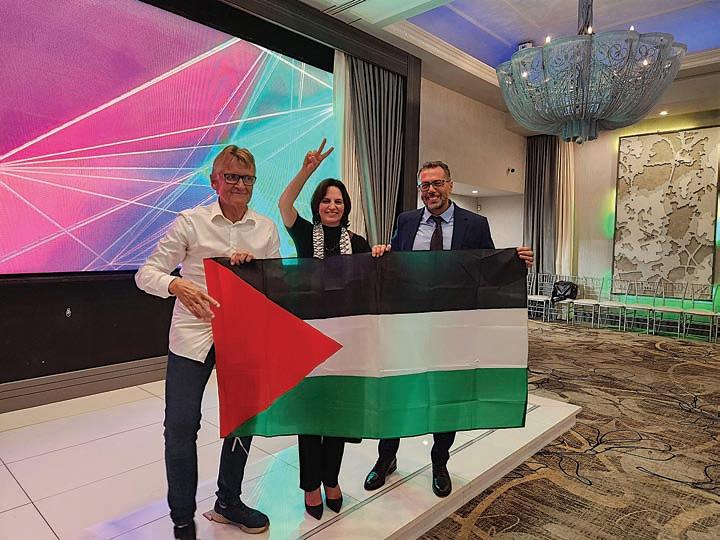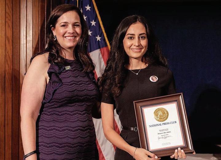 Slain Al Jazeera journalist Shireen Abu Akleh was honored at the National Press Club’s Annual Journalism Awards Dinner in Washington, DC on Aug. 31, 2022. Press Club president Jen Judson (l) presented Abu Akleh’s posthumous award to the journalist’s niece, Lina Abu Akleh (r), who de manded President Joe Biden hold Israel accountable for her aunt’s murder. “As a U.S. citizen and journalist, we had expected from the U.S. president that he would take the case seriously, as in similar cases,” she said. “We will never relent in bringing justice for Shireen,” she added.