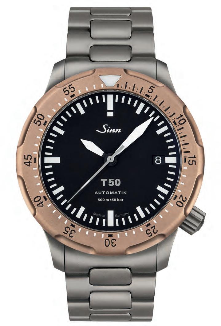 Model T50 GBDR. ø 41 mm. Duikershorloge met gezekerde draaibare lunette, beveiligd tegen per ongeluk verstellen. Kast van hoogwaardig titanium. Draaibare lunette van GOLDBRONZE 125, waarvoor SINN patent heeft aangevraagd, gematteerd. Lichtgevend materiaal met kleurcodering op de minuten- en secondewijzer en de hoofdmarkering op de draaibare lunette, voor een betrouwbare aflezing van de verstreken tijd. Saffierglas. Vacuümbestendig. Kroon op 4 uur om te voorkomen dat deze in de achterkant van de hand drukt. Ar-ontvochtigingstechnologie, dus meer functionele zekerheid en geen condensvorming. Waterdicht en drukbestendig tot 500 m duikdiepte (= 50 bar), gecertificeerd door DNV. Drie jaar fabrieksgarantie. Onder druk in topvorm.