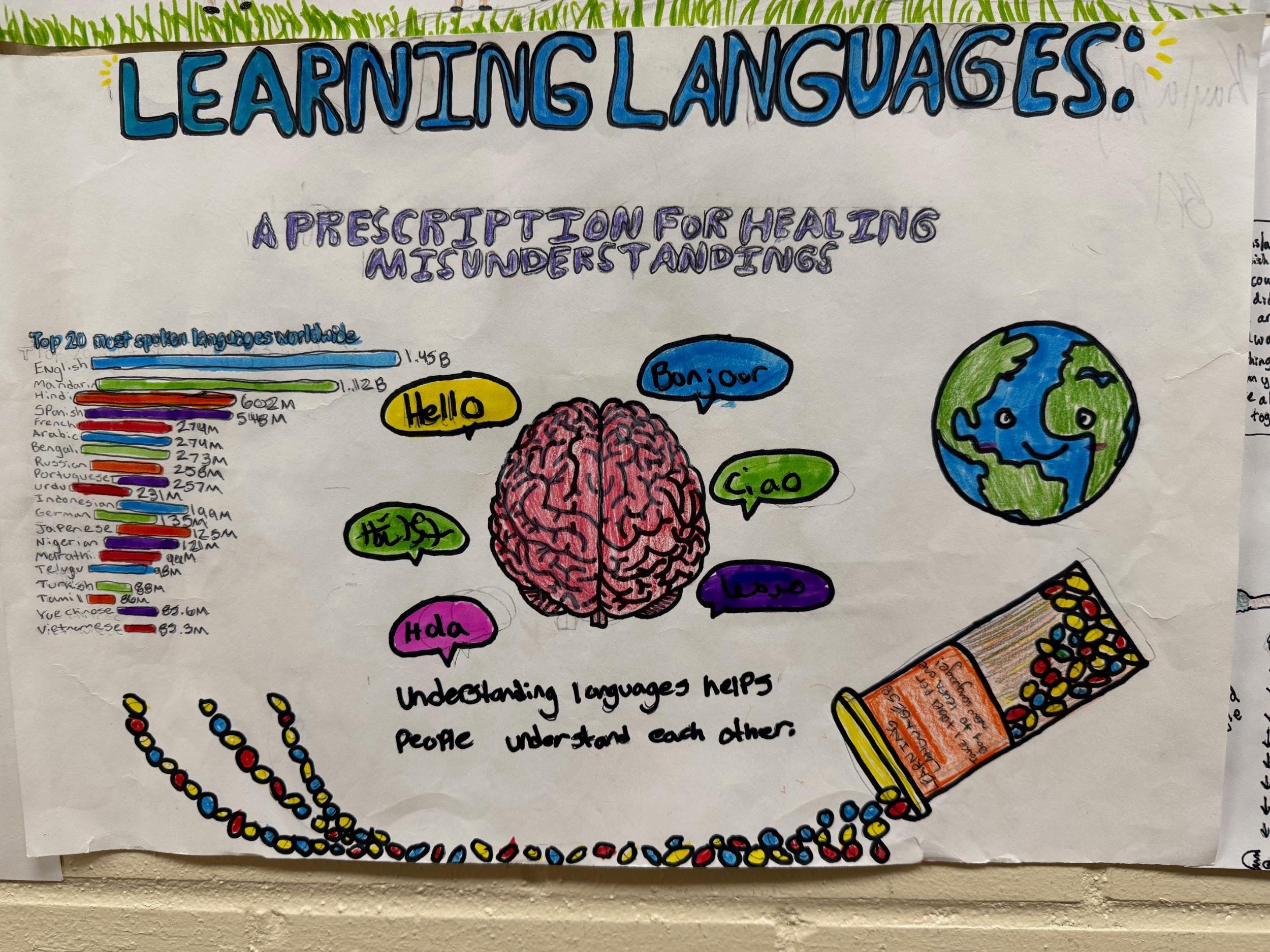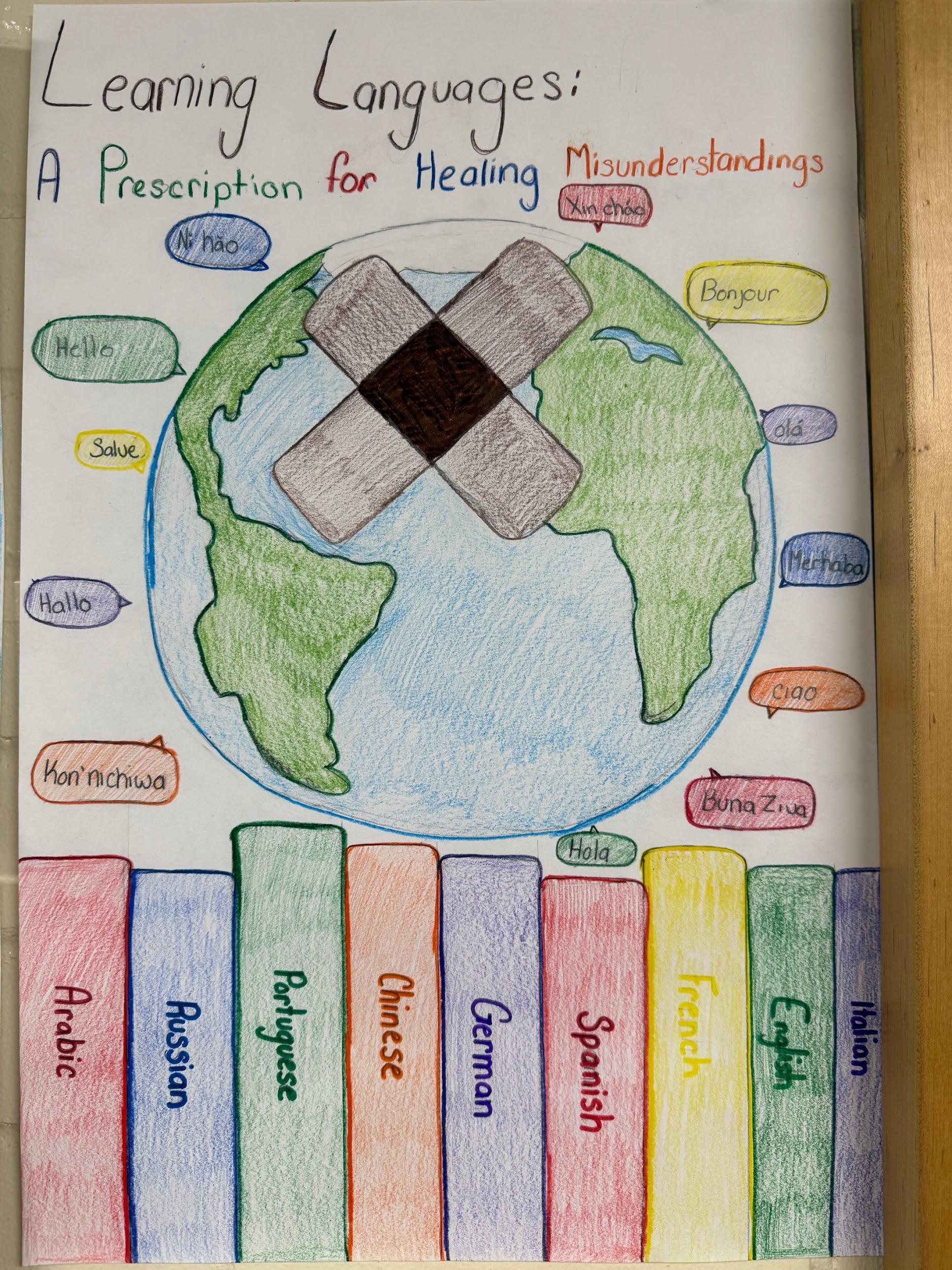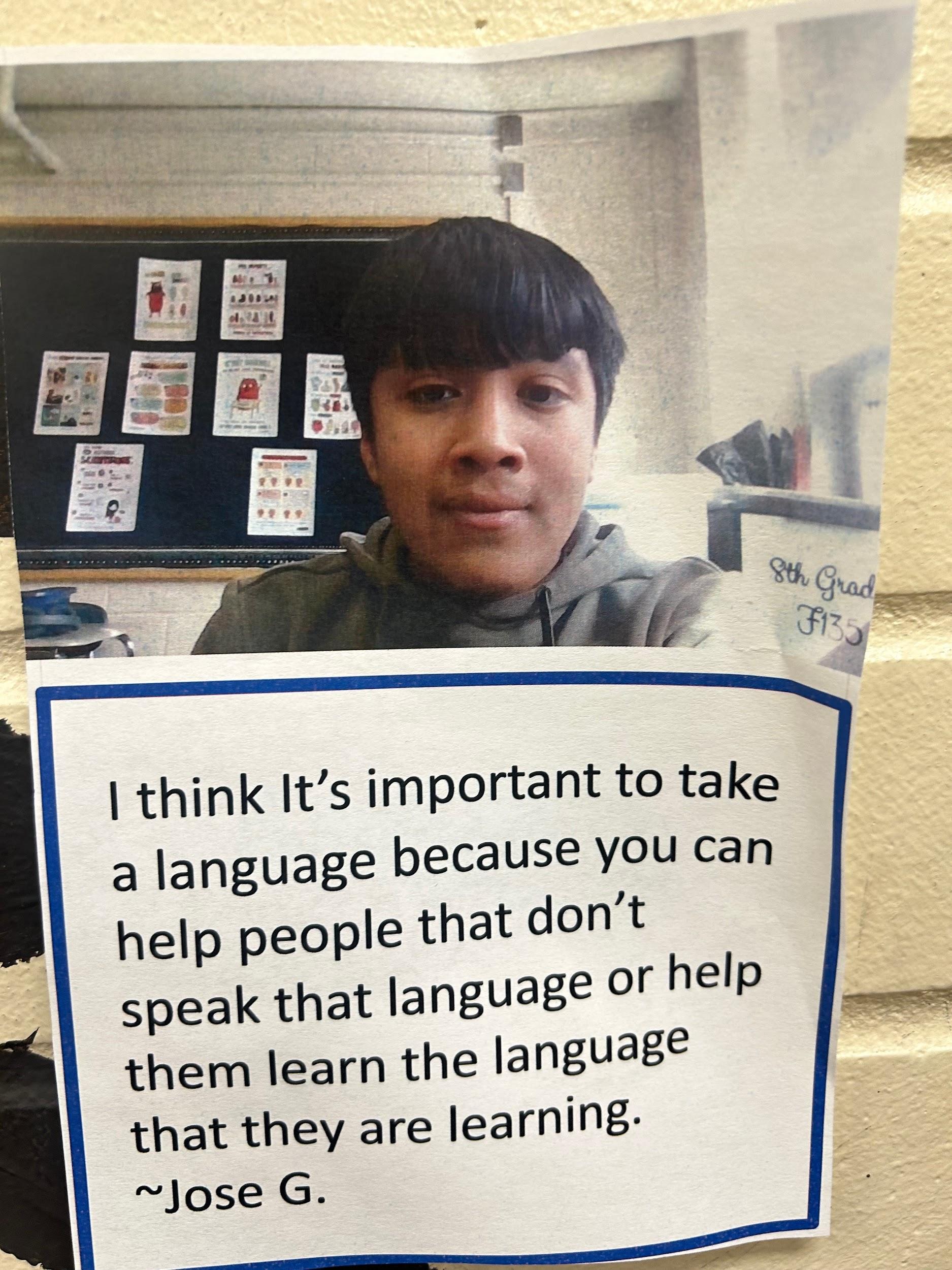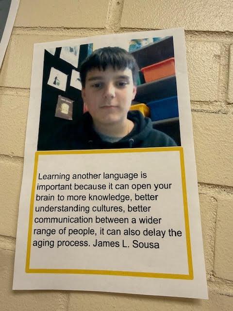 All eighth grade World Language students participated in the yearly poster contest. This year’s theme: Learning Languages: A Prescription for Healing Misunderstandings. Seventh grade students created word walls with their favorite word in French, Latin or Spanish. Sixth grade students shared their opinions about the importance of learning another language! We are proud of all our language students for their participation!
