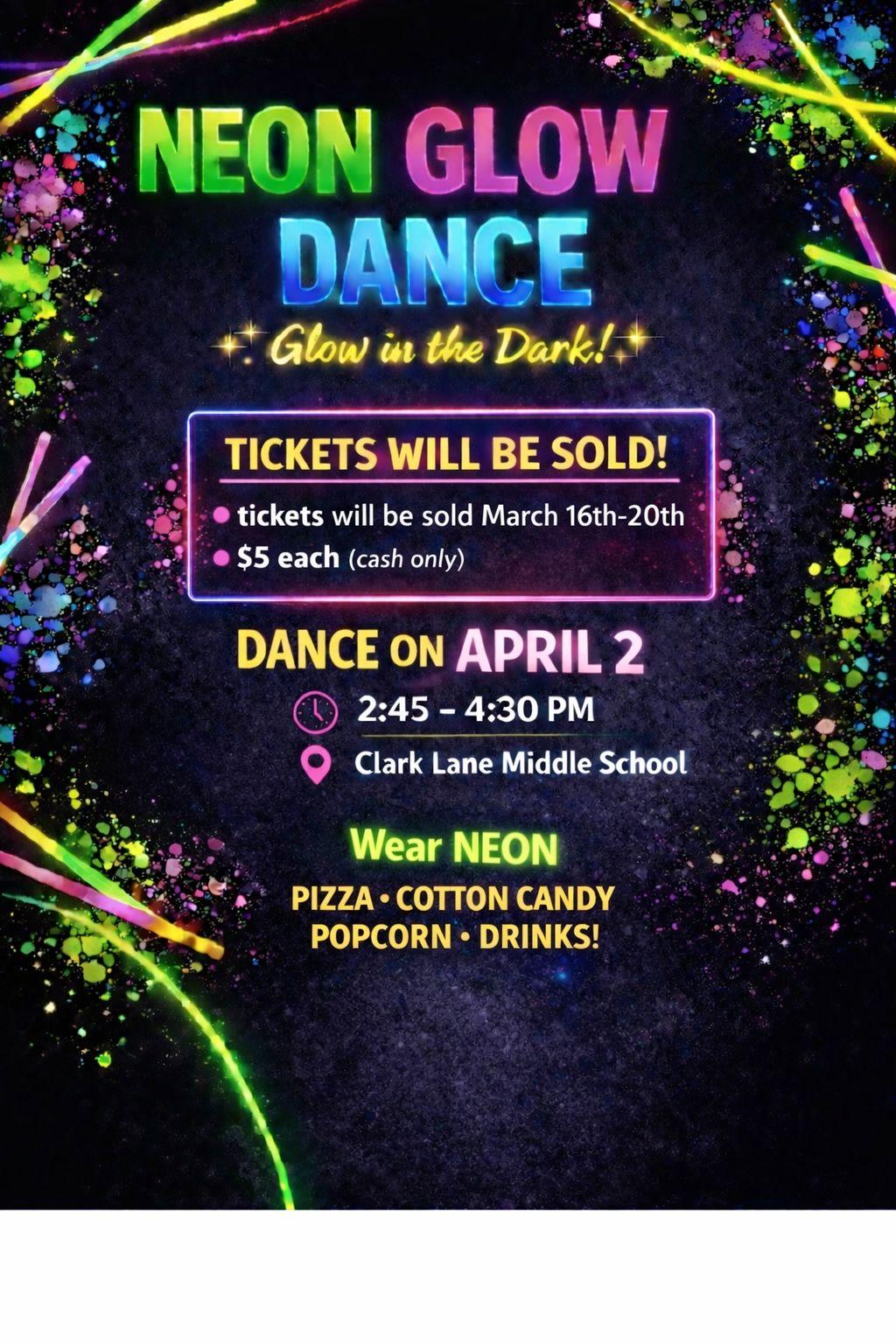 Thurs., April 2 - School Dance, Theme: Neon Glow Dance, 2:45-4:30 pm Fri., April 3 – School Holiday, No School