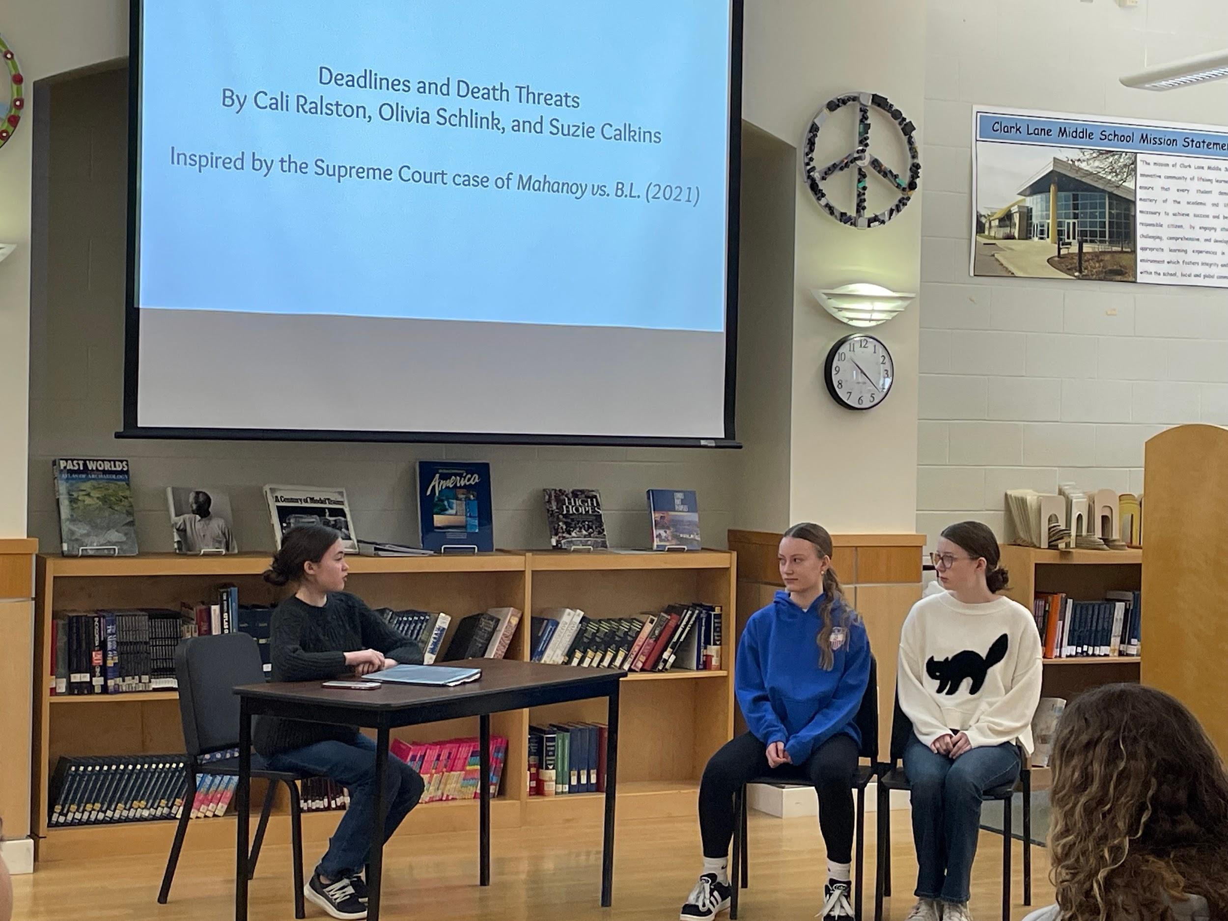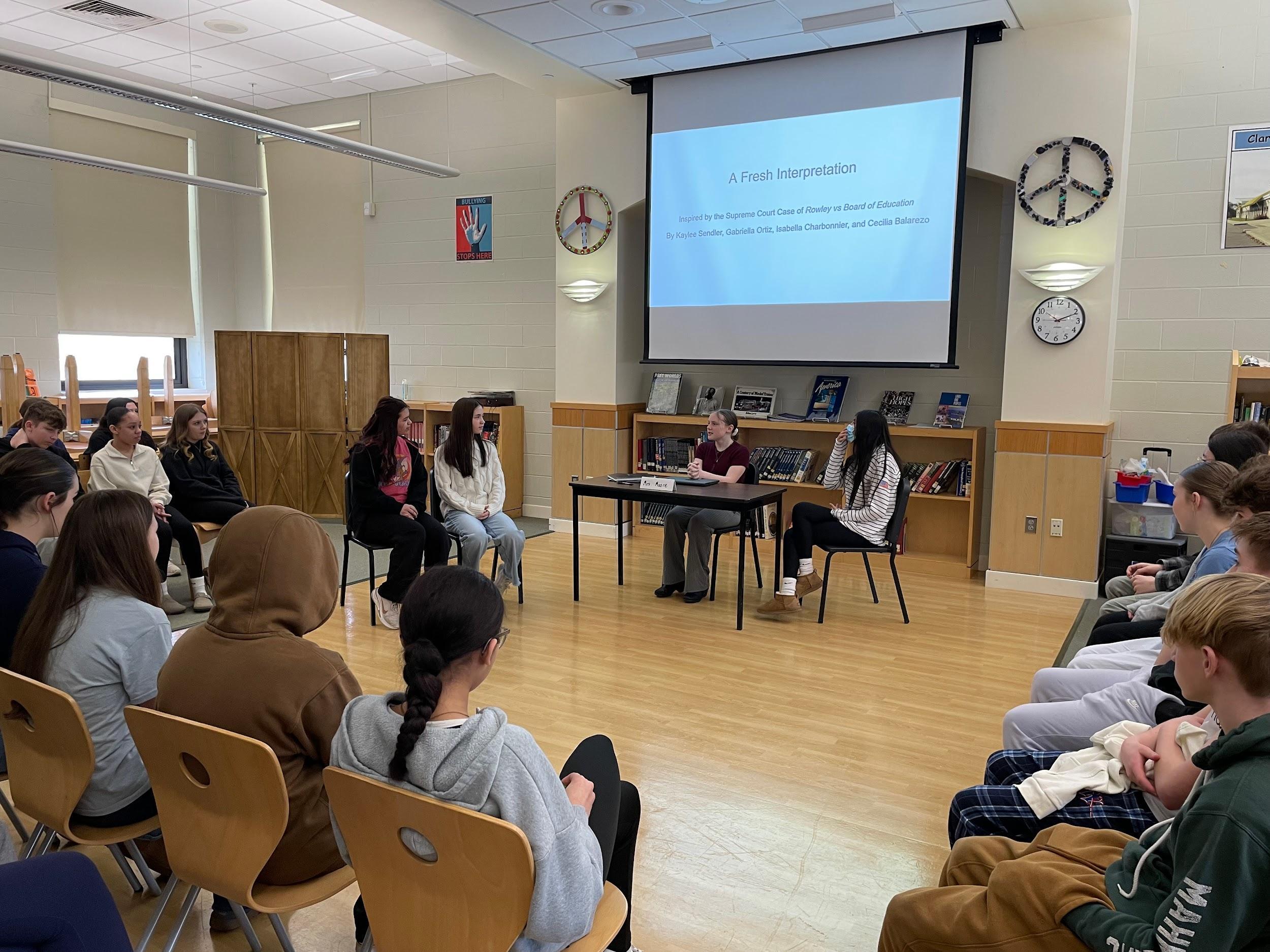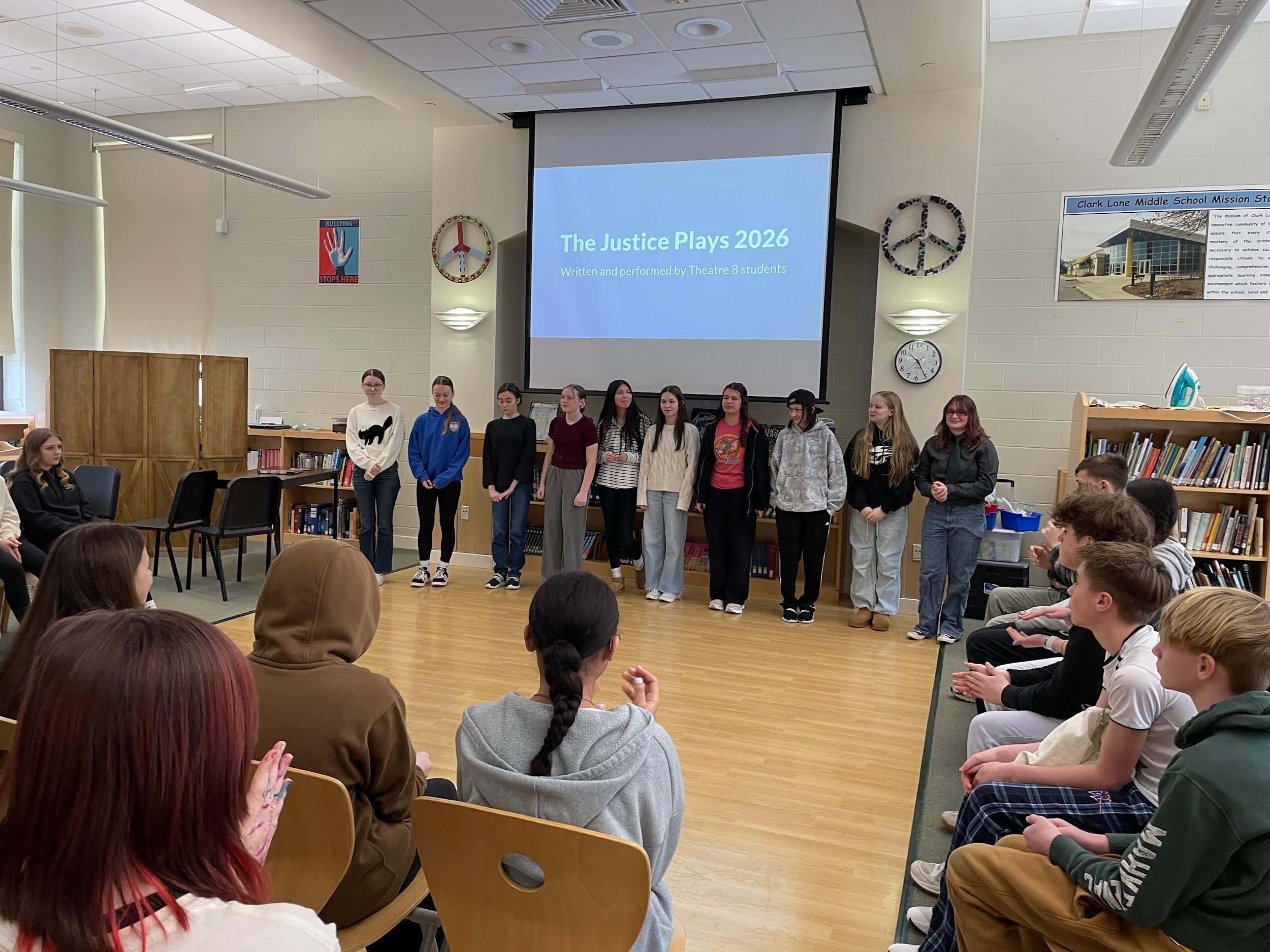 Mr. Barry's Theatre 8 students presented this year's edition of The Justice Plays in the library on Wednesday, March 18, for eighth grade Language Arts students. Their three plays--written, directed, and performed by students--were each inspired by a US Supreme Court case related to the rights of students in public schools. Following each play, the students presented further information about the original court case. Mr. Barry shares, “Students in the invited Language Arts classes then had the opportunity to ask questions about the writing process including how each group selected their case, developed their play and rehearsed.”