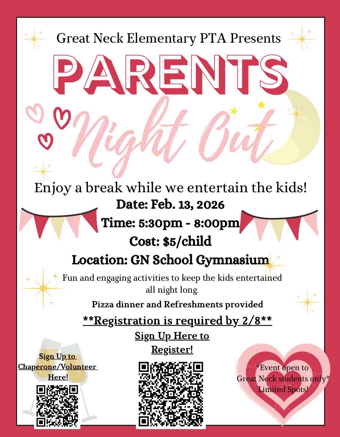 Feb. 13Save the Date– Parents’ Night Out5:30-8pm