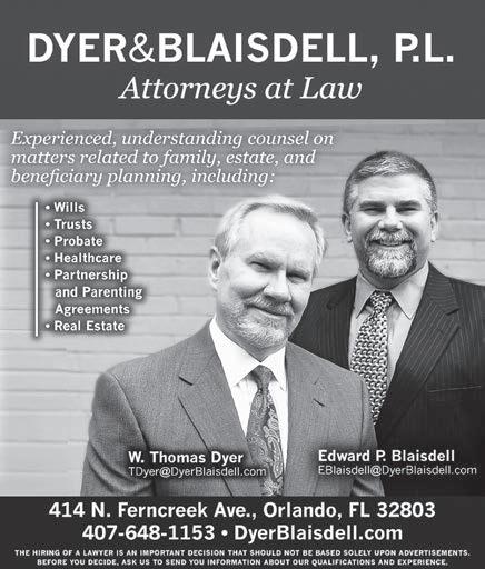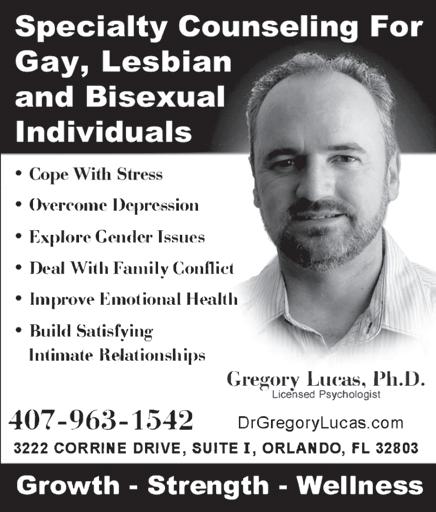 CENTRAL FLORIDA MARKETPLACE ACCOUNTING + BOOKKEEPING 407.478.4513 • ContactUs@geckoCPA.com L eah G. James, CPA, MSTax Judy L. Hines, CQA, CPB, CPS, CAP MARRIAGE & DOMESTIC PARTNER PLANNING PERSONAL/BUSINESS TAX PREPARATION, e-file QUICKBOOKS ADVANCED PROADVISOR ACCOUNTING + BOOKKEEPING Personal Returns from and Partnership Confidentiality Guaranteed. Tax Preparation Immediate appointments Taxes prepared while you wait! $89 Call for an appointment 407.923.4000 Stephen E. Roberts Professional Accounting and Tax Services 2180 N. Park Ave. Suite 220 Winter Park, FL 32789 AIR CONDITIONING 4seasonsair.net 407-295-9231 FL License#: CAC056308The A/C Company you wish you called rst. Up to $1700 in Rebates plus additional utility company incentives on quali ed units. We have the perfect deal on PERFECT AIR for your home COUNSELING ary arylie er annl s o 1307 Portland Ave. Orlando, 32803 Individuals & Couples - Anxiety - Depression Codependency - Gay & Lesbian - ACCOA FINANCIAL ADVISOR DICTOR FINANCIAL, LLC Wayne S. Dictor, President Office: 407-942-3366 Mobile: 941-320-4797 Wayne@DictorFinancial.com 2727 N Atlantic Ave - Box 900 Daytona Beach, FL 32118 Securities offered through Raymond James Financia Services, Inc. Member SIPC AIDS ORGANIZATION ATTORNEYS COUNSELORS + THERAPISTS COUNSELORS + THERAPISTS COUNSELORS + THERAPISTS watermark Your LGBTQ News Source. SEPT. 29 - OCT. 12, 2022 // ISSUE 29.20 WATERMARKONLINE.COM50
