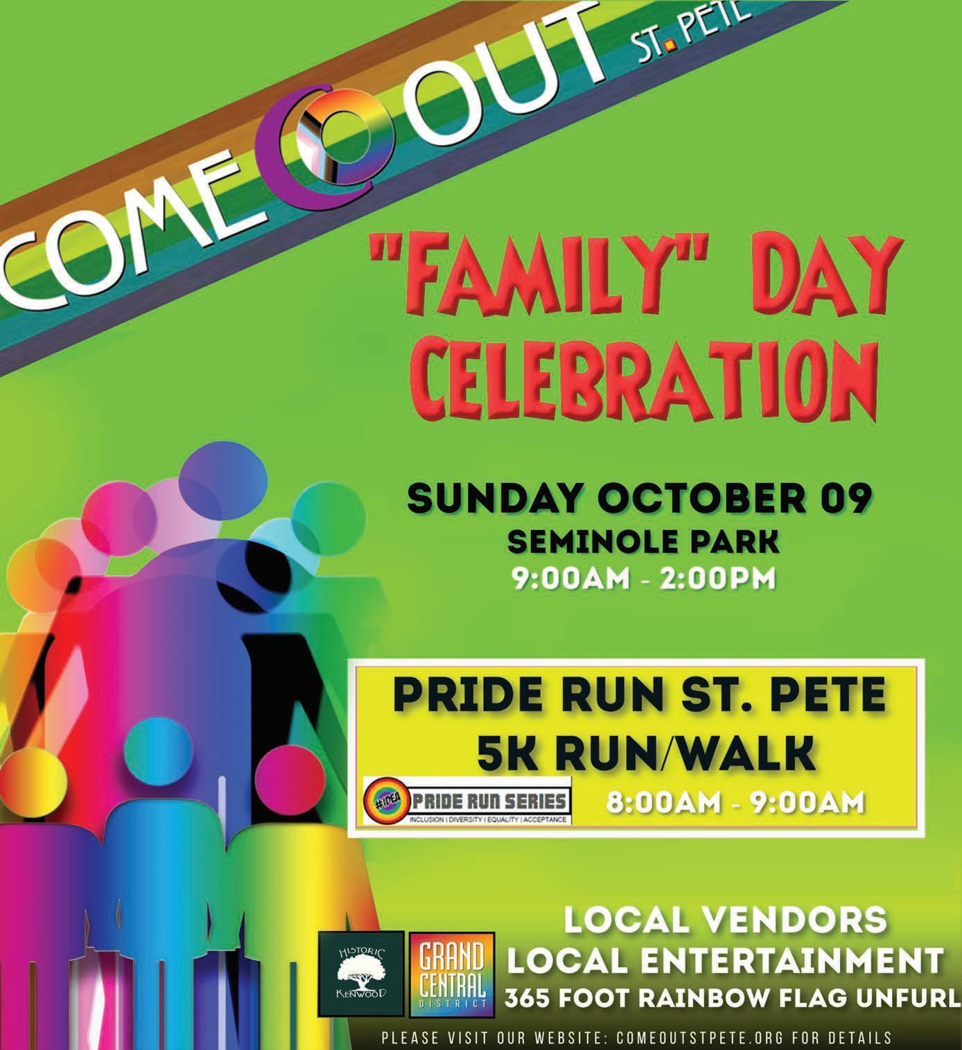 That includes this year’s inaugural “Family” Day Celebration Oct. 9 at Seminole Park, scheduled from 9 a.m.-2 p.m. It will be preceded by a Pride Run St. Pete 5K Run/Walk from 8-9 a.m.