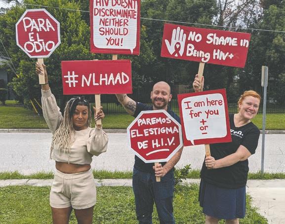1STOP THE STIGMA: (L-R) Gabriella Rodriguez, Andres Acosta and Kim Murphy show off signs they made for National Latino AIDS Awareness Day that will be used in Orlando’s upcoming Come Out With Pride parade.