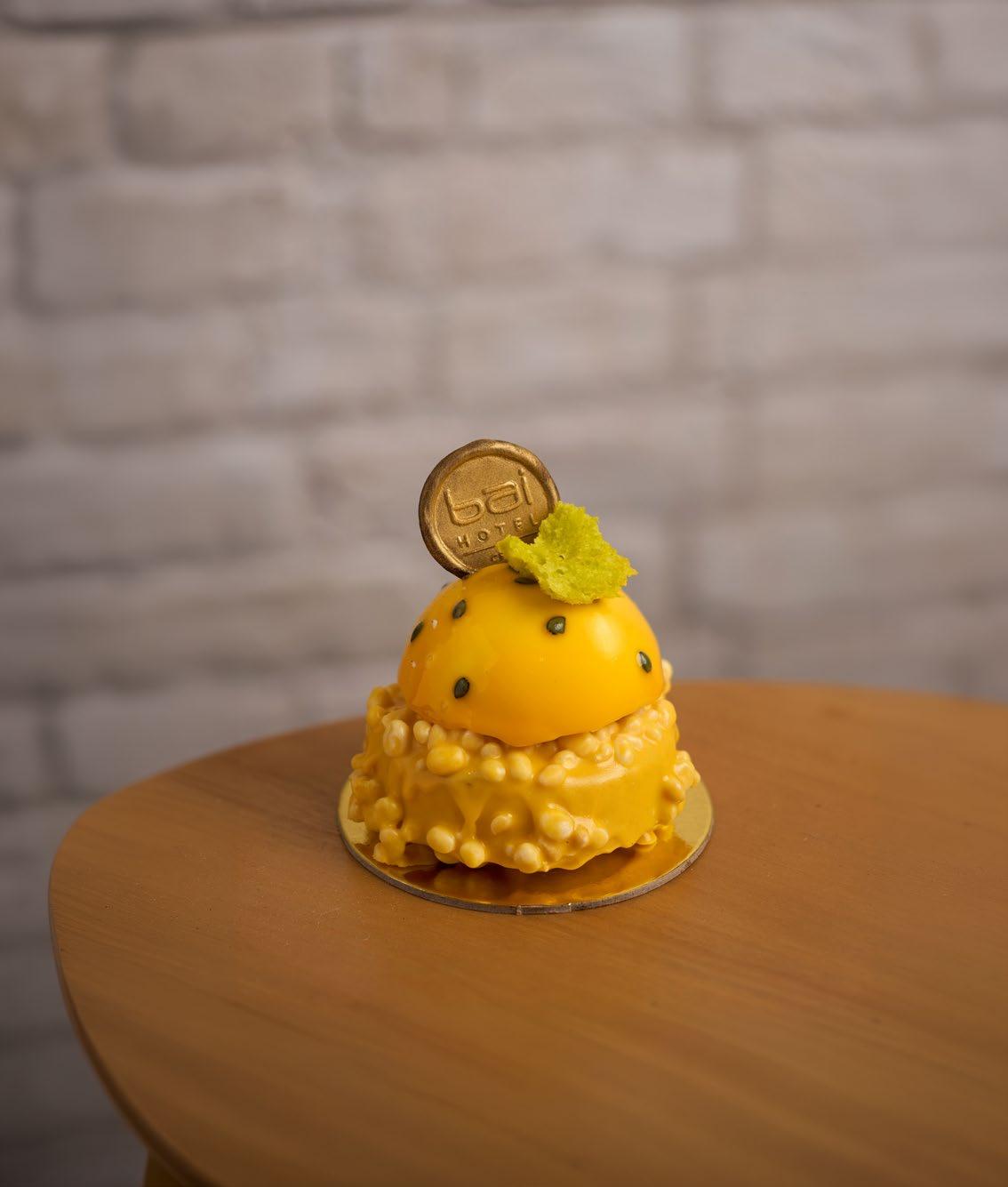 A vibrant, sun-kissed dessert featuring a velvety mango and passion fruit mousse set atop a crispy, chocolate-coated praline base.