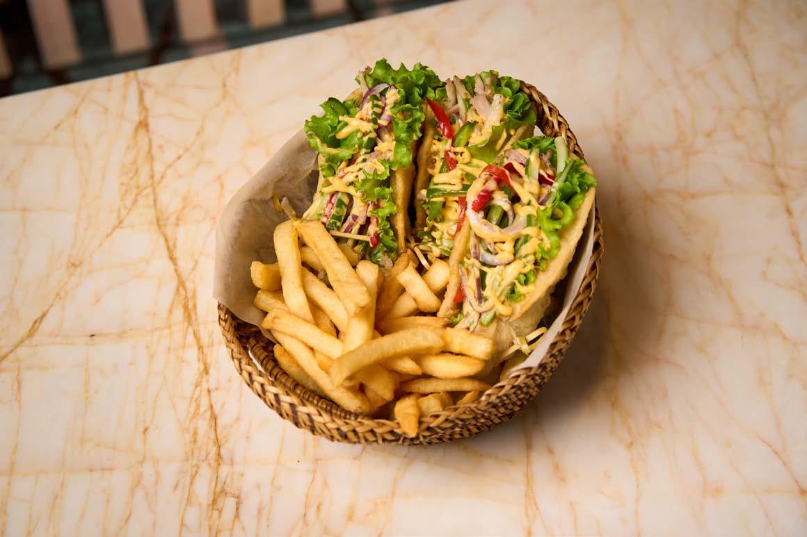 Fil-Mex Lechon tacos wrapped in warm tortillas and finished with tangy pickled onions, garlic crema, and fresh cilantro. Served with potato wedges or French fries.