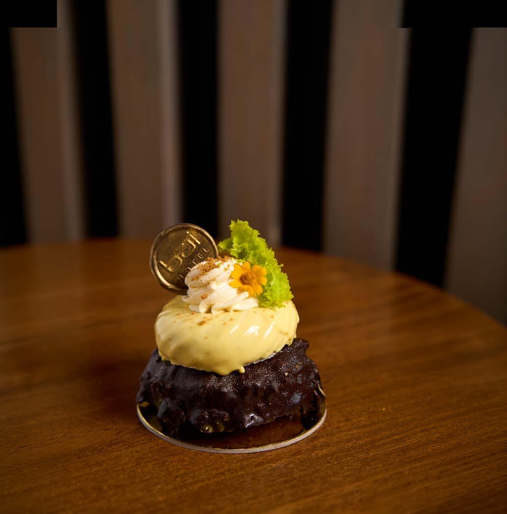 Velvet banana mousse and moist sponge on a chocolate snap, finished with vanilla chantilly clouds