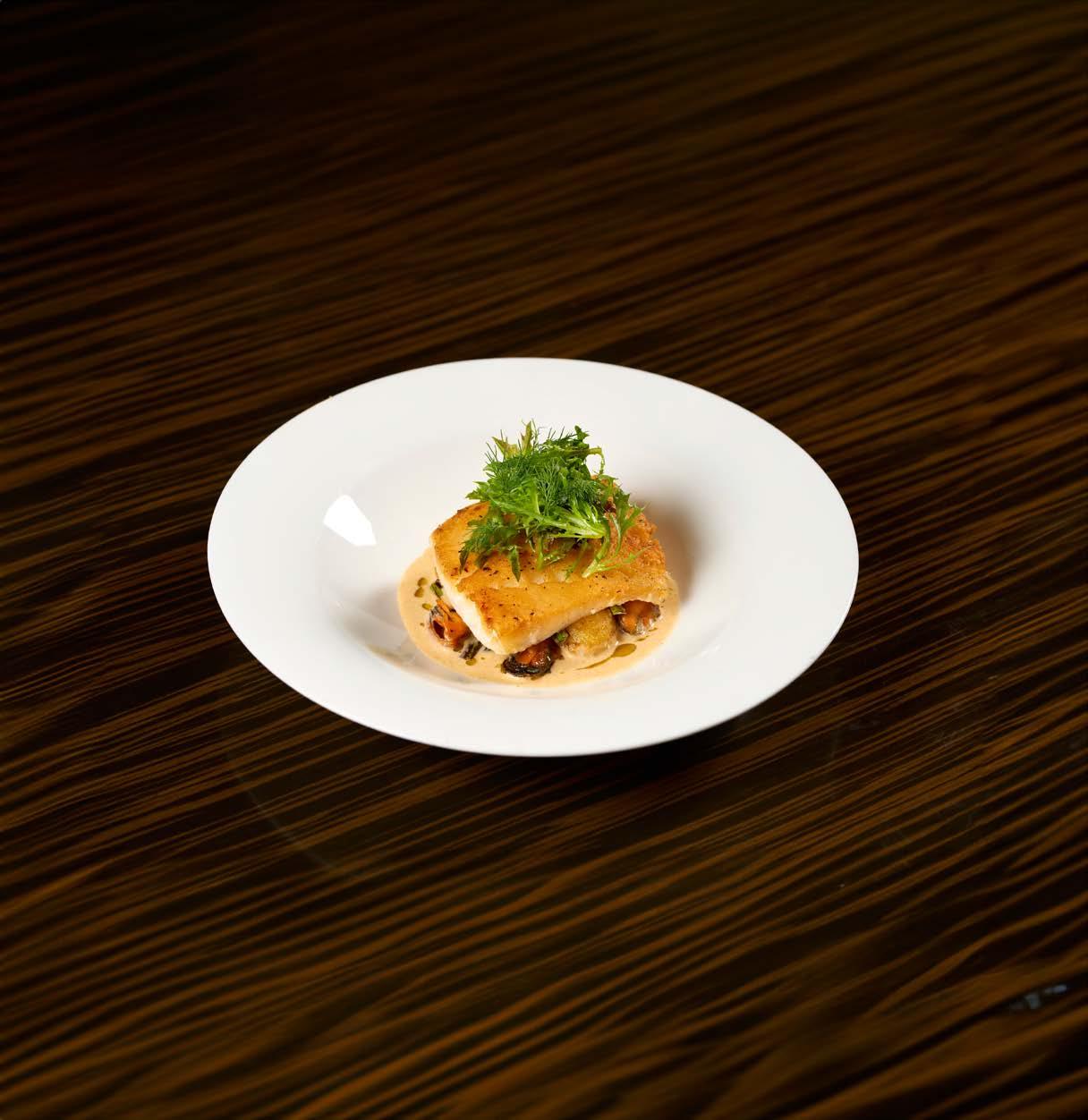 Seared Lamon-Lamon fillet with roasted garlic marbled potatoes, charred leeks, buttered mussels, and creamy mussel velouté sauce.