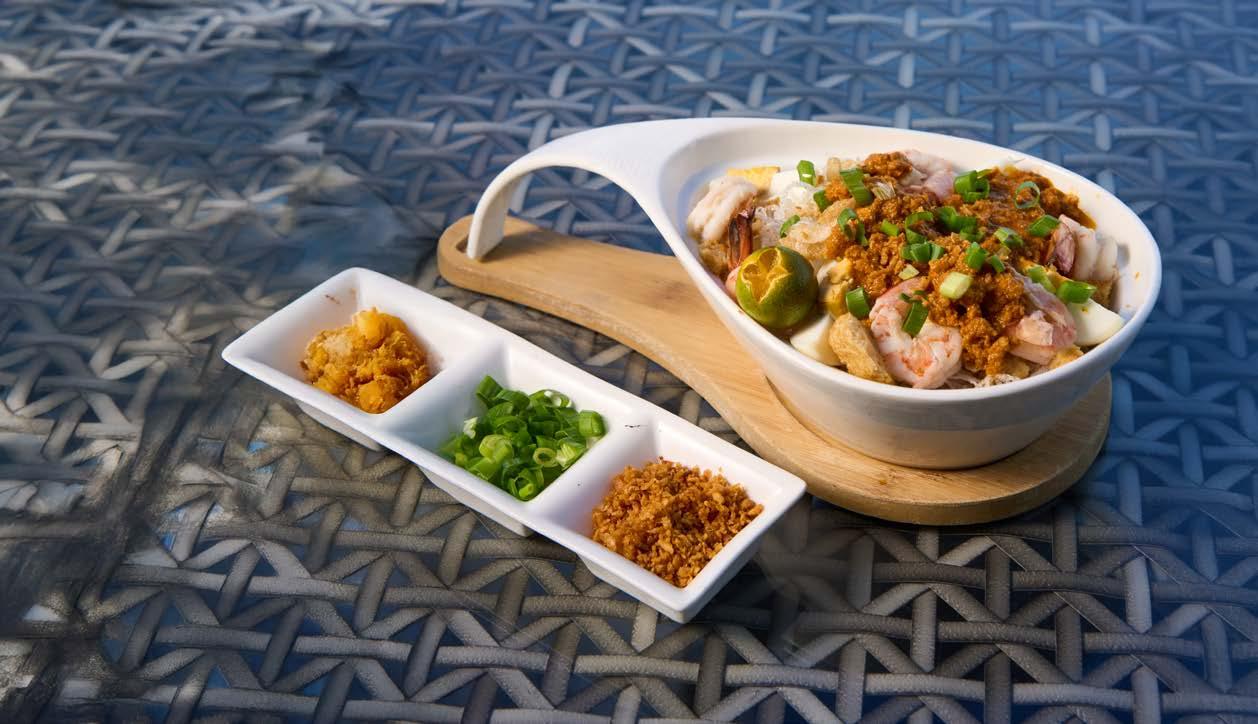 Crispy fried noodles topped with a rich shrimp broth sauce simmered with garlic, onions, and minced pork. Crowned with boiled egg, shrimp, chicharon, calamansi, and spring onions.