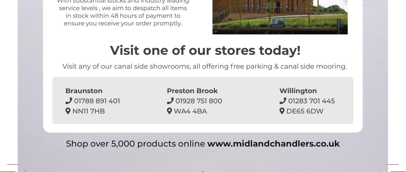 20 WHILTON MARINA CHANDLERY Well Stocked Chandlery, Diesel, Pump out, Groceries Pay us a visit, just browse and see what we have to offer Open daily 9am –6pm ALL YEAR ROUND Tel 01327 844639 E-mail: marinachandlery@gmail.com