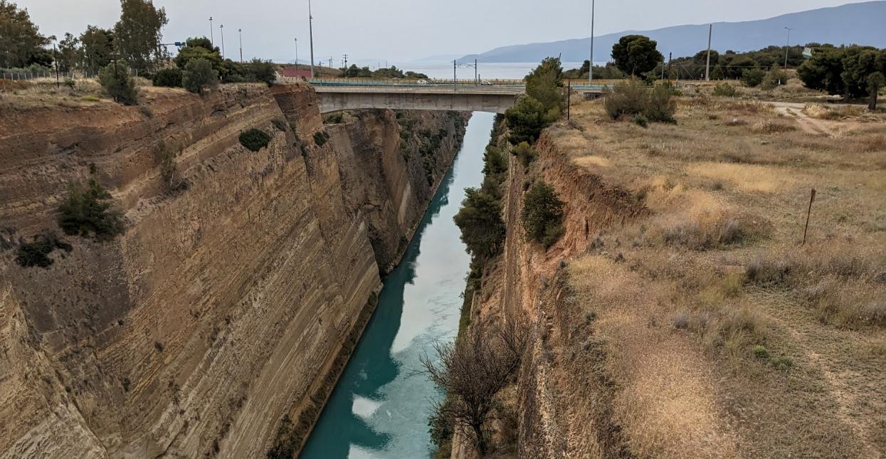 While we were on holiday in May, we visited the Corinth Canal in Greece. It connects the Gulf of Corinth in the Ionian Sea with the Saronic Gulf in the Aegean Sea. It cuts through the narrow Isthmus of Corinth. The Canal was dug through at sea level and has no locks . It’s 4 miles 6.4 kilometres in length and only 24.6 meters (80.7 feet) wide at sea level, making it impassable for many modern ships. The first proposal for digging such a cutting was in the 7th century BC. The project was abandoned and a less costly road was built instead.