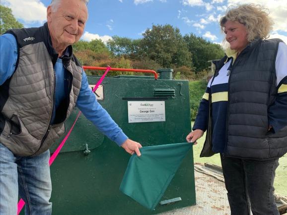 George's expertise in operating Mudlark, our dredger, is legendary. He was a man who could turn his hand to almost anything. He's sorely missed. We couldn't let George's valuable contribution to the restoration of the Canal go without paying tribute. It was decided to mark this with inscribed plaques affixed on either side of Mudlark