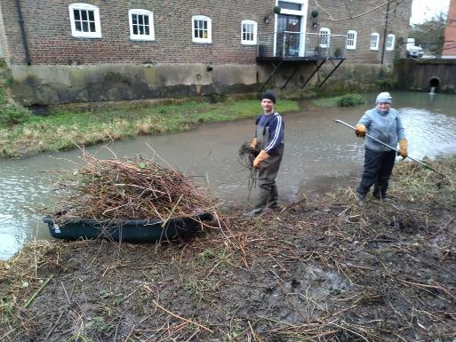At Lower Hartshay, on the FCC managed section, clearing the channel of reeds and trees, trimming the overgrown hedging and providing views over the water meadow for bird watchers.