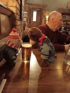 Fortunately, there are nice moorings just below the first lock, so our humans stopped there for the night, and Hanley and Huddlesford went with them to have dinner and to test Grizzly's beer in the pub.