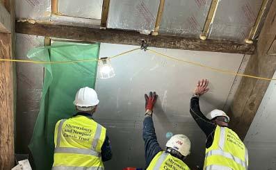 Wappenshall Wharf Project (restoring the historic warehouses at the junction of the Shrewsbury Canal and Newport Canal as a community centre and canal centre) is really moving forward now. The cast iron windows that were cast by St Gobain Ironworks in Ketley for us have been installed, glazed and painted. First fix plumbing and electrics have been completed and the internal fit-out has begun. This has involved fitting dry wall studding framework and mineral wool insulation, plus plaster-boarding the ceiling and walls.