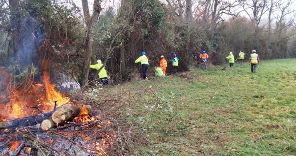 ogy. There are two areas where these will be used. Placing these on top of a dry-stone wall with an uneven surface is a fiddly job but over Saturday and Sunday, one stretch was completed, a length of 12.2 metres. A total of 20 metres of copings have now been placed on the repaired wall. A further 70 metres remains – this will now wait till next year when water levels in this part of the channel once again become manageable. One of several activities planned for the winter is hedgelaying in an area of Phase 2. In preparation for this, a quantity of dead wood (saplings and small trees) was removed from the hedge to the bonfire area and piled around the stump ready for future burning. Completed section of wharf wall