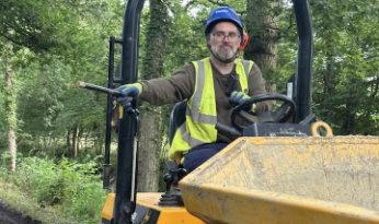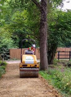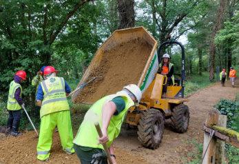 to excavate a level base over as much of the length as we could over the first weekend of the camp. Early starts and late finishes by digger drivers Pete Bunker and Adam ‘Digger’ Morris (out from retirement for this special project!) saw the levelling off of the worst 700m of the path ready for stone laying to start. The stone being used is no ordinary Type 1 limestone but a sandy coloured local stone from the quarry at Fittleworth to the west of Pulborough. This is the stone preferred by horse riders as it doesn’t have sharps that cut into hooves. Of course being in Surrey / Sussex it is also expensive! The Trust was therefore pleased to receive grants from local authority Community Infrastructure Levies of £45,000. This is expected to cover about 66% of the total cost. The snag is that you don’t get the