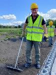 As a diversion and while we were getting ourselves sorted out, Phil and Harry were sent off to remove an earth causeway across the canal to the south of the camp work site. Material from this was deposited in the adjacent field (owned by the Trust) and levelled. Meanwhile on the towpath-to-be, Duncan occupied the small digger: spreading the base stone that was far too large to move with rakes. Starting at the furthest exteremity of 1.2km from the compound, over the days of the camp Rob, Graham and Mike on the roller progressively edged their way south down the canal. On the best day over 100m of base stone was put down and levelled. Each day the distance to the stone pile was reduced with a consequent marginal increase in work rate.