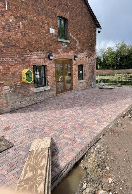 Work on the Shrewsbury and Newport canals continues now we seem to have a summer! Wappenshall Wharf, the location of the historic warehouses at the meeting point of the two canals, which the Shrewsbury & Newport Canals Trust is turning into community centre and canal centre, is coming on really well now, with the external work to lay block paving around the smaller warehouse that will become our café.