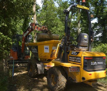 Work on placing the base stone started in earnest on the Monday – but not before the job had been extended to Rosemary Lane following the intervention of the Surrey Footpaths Officer who rightly intimated that to leave the last 60 metres untouched would be nonsense. He advised that he could instruct the works whether or not the land owner consented. He proceeded to do just that! However, a quick knock on the owner’s door followed and all was agreed. This was a plant intensive camp. WACT’s Dave Evans, on his last job with the Trust before moving on to pastures new, had ordered 6 x 3 tonne swivel dumpers, a 3 tonne excavator to spread the material, a siton roller and an 8 tonne excavator to load and manage the stockpile of stone at the site compound. Add to this the Trust’s own 6 tonne excavator and it was clear that we