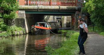 The Ashton and Rochdale canals were rivals and the connection between them near Manchester’s Piccadilly Station is secretive and sinuous. It’s quite a difficult route with a pair of boats. Apart from a slight cock-up when shortening the towline, we managed it