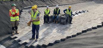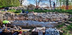 Many previous sections have benefited from access along a temporary haul road constructed on the opposite bank to the towpath, but for the remainder of this project we don’t have that luxury. Instead, materials are delivered to the work area along the bed of the channel. Just as well then that the site was dry – this volume of traffic would have created a quagmire in different circumstances. Volunteers adapted quickly to the change. No comments were heard lamenting the absence of the fabled block delivery chute (previously used to deliver blocks to the work area from the haul road) and by Sunday afternoon, a remarkable 47 metres of lining and blocking had been achieved. Over 3,500 blocks were used, each laid by hand. Blocks finish just below water level and admittedly the banks above water level still require completion, but nevertheless this is a work party record length, certainly for the current project and possibly the greatest of all time. (The