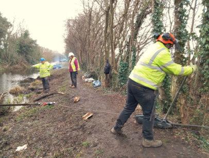 Themain focus for this work party was to start lining and blocking a further section of prepared channel. This next section, the final part of Phase 1B, takes us a further 135 metres towards the Schoolhouse Bridge. Once complete, the remainder of the works will be undertaken from the Schoolhouse Bridge end of the site and we shall relocate to a compound by the bridge later in the year.