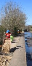 Aside from clearing, profiling and lining the channel there are always a multitude of other tasks required in support. Time was spent on Saturday cutting pegs from lengths of angle iron for securing towpath boards and, on Sunday, cutting lengths of lining materials ready for the next work party.