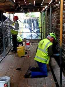 Work has started on clearing the inside of the workshop. As it is listed, planning permission is required before making any repairs. Work parties take place on Wednesdays weather permitting. Details for this are on the website.